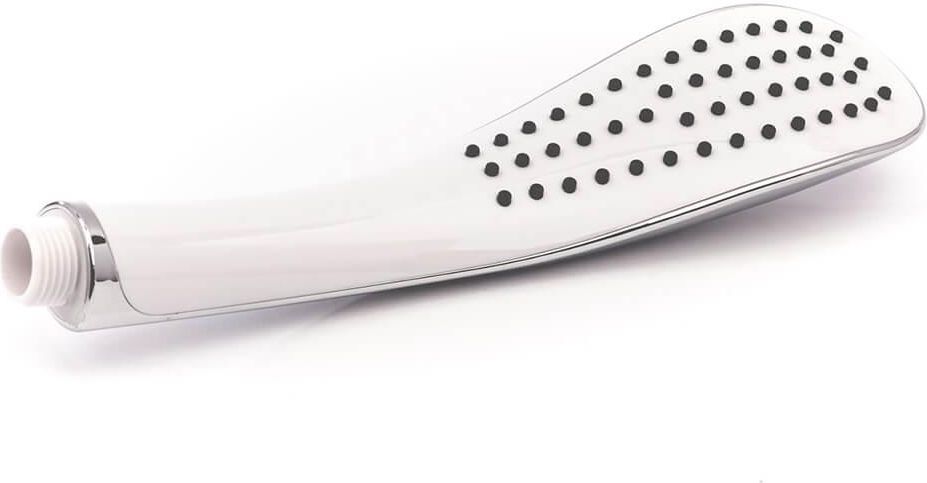 Biała słuchawka prysznicowa Biała słuchawka prysznicowa wykonana z materiału ABS. Charakteryzuje się wysoką wytrzymałością i trwałością. Jakość wykonania tego modelu stoi na wysokim poziomie. Tylny element słuchawki pokryty jest chromem, front natomiast wykonano w kolorze białym. Dzięki temu słuchawka zyskała elegancki, a także nowoczesny styl. Ten model słuchawki ma także ergonomiczny kształt korpusu, co znacznie zwiększa wygodę użytkowania. Gwint do węża prysznicowego to oczywiście ½ cala. System Anti-Calc Marka Sannit wyposażyła ten model słuchawki w zakończenia wylotu wody w systemie Anti-Calc. Każda mikro dysza posiada elastyczną silikonową końcówką. W związku z tym kamień z twardej wody nie osadza się u wylotu ze słuchawki. Dzięki temu rozwiązaniu wszystkie ujścia wody pozostają drożne. Elastyczność mikro dysz białej słuchawki prysznicowej daje możliwość wykruszenia nagromadzonego osadu z wnętrza słuchawki. Również osad pozostający wokół dysz bardzo łatwo usuwa się z materiału ABS, z którego wykonana jest przednia część słuchawki.