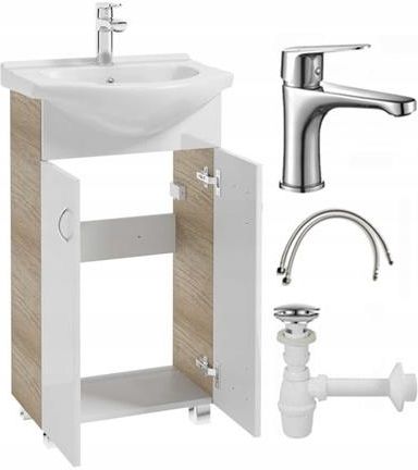Szafka łazienkowa z umywalką baterią i syfonem 50x86cm stojąca biały front Zestaw łazienkowy to harmonijne połączenie funkcjonalności i stylu. Składa się z eleganckiej, ceramicznej umywalki oraz szafki z frontami w białym kolorze i bokami w odcieniu dębu monumentalnego. Dzięki takiej stylistyce zestaw idealnie wpisuje się w nowoczesne wnętrza, dodając im naturalnego charakteru. Szafka została wykonana z trwałej płyty meblowej o grubości 16 mm, co gwarantuje jej wytrzymałość i odporność na wilgoć. Imitacja drewna inspirowana naturą doskonale współgra z wnętrzami w stylu eko, natomiast w połączeniu z nowoczesnymi dodatkami stanowi wyjątkowe uzupełnienie współczesnych łazienek. Ten komplet łazienkowy to idealne rozwiązanie zarówno do małych, jak i większych łazienek, zapewniające wygodę użytkowania i estetyczny wygląd. W skład zestawu łazienkowego wchodzą Umywalka ceramiczna o szerokości 50 cm, Szafka pod umywalkę, Chromowana bateria jednouchwytowa, Półsyfon umywalkowy. Zalety Kompleksowość: Zestaw zawiera wszystkie niezbędne elementy – umywalkę, szafkę, baterię i półsyfon, eliminując konieczność dokupowania dodatkowych akcesoriów. Stylowy design: Białe fronty w połączeniu z bokami w odcieniu dębu monumentalnego nadają meblowi elegancji i uniwersalności. Wszechstronność: Zestaw doskonale pasuje zarówno do wnętrz w stylu eko, inspirowanych naturą, jak i do klasycznych, przytulnych aranżacji. Wytrzymałość: Szafka wykonana z płyty meblowej o grubości 16 mm charakteryzuje się trwałością i odpornością na wilgoć. Funkcjonalność: Kompaktowa umywalka o szerokości 50 cm sprawdza się zarówno w małych, jak i większych łazienkach. Łatwość aranżacji: Naturalne akcenty i nowoczesne detale czynią zestaw doskonałym uzupełnieniem każdego wnętrza, od minimalistycznych po bardziej dekoracyjne. Parametry Zastosowanie: Meble łazienkowe Kolor dominujący: Biały, Dąb monumentalny Wysokość całkowita: 80 cm Szerokość całkowita: 50 cm Wysokość nóżek (cm): 2,5 cm Klamki, uchwyty: Uchwyt dwupunktowy Sposób montażu: Do samodzielnego montażu Wykonanie umywalki: Ceramika Wykonanie korpusu: Płyta wiórowa 16 mm dąb monumentalny Wykonanie frontu: Płyta wiórowa 16 mm biała Waga: 19,5 kg Kolor Frontu: Biały Kolor Korpusu: Dąb monumentalny Wysokość szafki z umywalką: 86 cm Szerokość szafki: 45 cm Głębokość szafki: 26 cm Szerokość umywalki: 50 cm Głębokość umywalki: 40 cm Bateria w zestawie: Tak Wysokość baterii: 16,5 cm Zasięg wylewki: 12 cm Półsyfon w zestawie: Tak