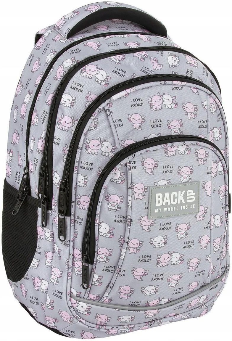 Plecak szkolny BackUP Axolot Love dla dziewczynki szary z Axolotem A12 Urocze, pastelowe axoloty przesyłające buziaki to bohaterowie tej wyjątkowej kolekcji. Ich delikatne kolory pięknie kontrastują z eleganckim, szarym tłem, tworząc nowoczesny i stylowy wzór, który z pewnością przyciągnie …