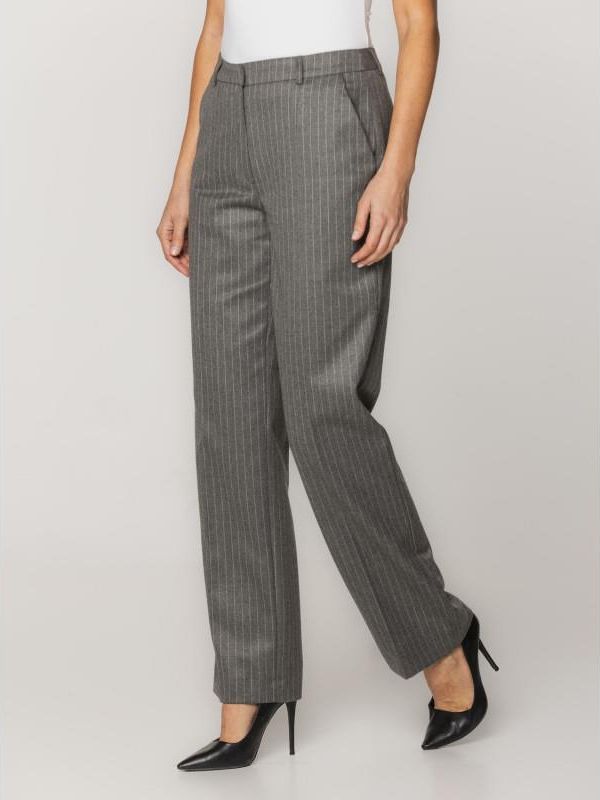 Klasyczne, jasnoszare spodnie garniturowe w delikatne prążki o prostym fasonie, z zaprasowanymi kantami