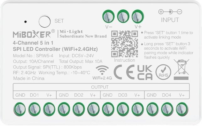 Sterownik LED Cyfrowy Wi-Fi Mi-Light SPIW5-4 4-kanały Sterownik LED Cyfrowy Wi-Fi Mi-Light SPIW5-4 to nowoczesny kontroler przeznaczony do obsługi cyfrowych, programowalnych taśm LED SPI. Model ten został zaprojektowany z myślą o instalacjach efektowych, w których istotne jest niezależne sterowanie sekcjami taśmy, tworzenie animacji świetlnych oraz wygodna obsługa z poziomu aplikacji Tuya Smart i systemu radiowego Mi-Light / MiBoxer. To bardzo ważne, ponieważ SPIW5-4 nie jest klasycznym sterownikiem do taśm analogowych – został stworzony specjalnie do pracy z taśmami cyfrowymi wykorzystującymi sygnał SPI. Urządzenie oferuje 4 indywidualne wyjścia, dzięki czemu umożliwia niezależne sterowanie 4 strefami taśmy LED SPI. Dzięki komunikacji Wi-Fi + 2,4 GHz sterownik może być obsługiwany zarówno z poziomu aplikacji, jak i za pomocą kompatybilnych pilotów oraz paneli Mi-Light / MiBoxer. To rozwiązanie szczególnie przydatne w nowoczesnych aranżacjach, reklamie, oświetleniu dekoracyjnym i wszędzie tam, gdzie potrzebne są dynamiczne efekty oraz wygodne sterowanie bezprzewodowe. Mi-Light SPIW5-4 – do czego służy? Mi-Light SPIW5-4 służy do sterowania cyfrowym oświetleniem LED SPI, czyli taśmami i modułami LED, w których możliwe jest programowanie efektów świetlnych, kierunku animacji, kolorów i sposobu działania poszczególnych pikseli. W przeciwieństwie do standardowych sterowników napięciowych, które sterują całym odcinkiem taśmy jednocześnie, SPIW5-4 obsługuje taśmy adresowalne, co pozwala uzyskać bardziej zaawansowane i efektowne animacje. Model ten sprawdzi się w instalacjach dekoracyjnych, nowoczesnych wnętrzach, reklamie, witrynach, meblach, ekspozycjach i projektach efektowych, gdzie ważna jest możliwość sterowania cyfrowym światłem oraz podziału instalacji na kilka niezależnych sekcji. To sterownik przeznaczony do oświetlenia cyfrowego, a nie do zwykłych taśm LED stałonapięciowych. Możliwości sterownika Mi-Light SPIW5-4 Obsługa cyfrowych taśm LED SPI – sterownik przeznaczony do programowalnego oświetlenia adresowalnego. 4 indywidualne wyjścia – niezależne sterowanie 4 strefami taśmy LED SPI. Komunikacja Wi-Fi + 2,4 GHz – sterowanie z aplikacji oraz z pilotów Mi-Light / MiBoxer. Wyjście sygnału SPI (TTL) 800 Kbps – zgodne z cyfrowymi taśmami LED. Obsługa do 1024 pikseli – duże możliwości dla rozbudowanych instalacji cyfrowych. Regulacja różnych trybów pracy – wygodne dopasowanie działania sterownika do konkretnej instalacji. Zmiana koloru i jasności – pełna kontrola nad charakterem światła. Dynamiczne efekty świetlne – możliwość uzyskania atrakcyjnych animacji i sekwencji. Podział na strefy – wygodne zarządzanie niezależnymi sekcjami oświetlenia. Nowoczesna integracja smart – możliwość rozbudowy systemu o sterowanie aplikacją i elementy Mi-Light / MiBoxer. Mi-Light SPIW5-4 – kompatybilne instalacje Sterownik SPIW5-4 został zaprojektowany do współpracy wyłącznie z cyfrowymi taśmami LED SPI. Oznacza to, że urządzenie nie jest przeznaczone do standardowych taśm analogowych sterowanych napięciowo, lecz do nowoczesnych instalacji, w których światło działa w oparciu o sygnał cyfrowy i adresowanie pikseli. Taśmy LED SPI – do programowalnych taśm cyfrowych Instalacje wielostrefowe – do projektów wymagających niezależnego sterowania 4 sekcjami Oświetlenie dekoracyjne i efektowe – do nowoczesnych aranżacji świetlnych Dzięki takiej konstrukcji SPIW5-4 świetnie sprawdza się w nowoczesnych projektach efektowych, gdzie ważna jest precyzja sterowania, wygodny podział na strefy i możliwość tworzenia dynamicznych animacji świetlnych. Sterowanie i obsługa Sterowanie pilotem – współpraca z kompatybilnymi pilotami 4-strefowymi Mi-Light C10. Sterowanie aplikacją mobilną Tuya Smart – obsługa przez moduł Wi-Fi. Bezpośrednia łączność Wi-Fi – wygodne sterowanie bezprzewodowe w nowoczesnej instalacji. Praca radiowa 2,4 GHz – stabilna współpraca z kontrolerami systemowymi. Niezależne sterowanie 4 wyjściami – możliwość wydzielenia osobnych stref świetlnych. Konfiguracja efektów – zmiana trybów, barw i charakteru animacji. Integracja z systemem Mi-Light / MiBoxer – łatwe włączenie do większej instalacji sterowania światłem. Cyfrowe sterowanie SPI – kluczowa różnica Najważniejszą cechą modelu Mi-Light SPIW5-4 jest to, że pracuje on z cyfrowymi taśmami LED SPI, a nie z klasycznymi taśmami analogowymi. W praktyce oznacza to możliwość uzyskania efektów, których nie da się osiągnąć przy użyciu zwykłych sterowników napięciowych – takich jak animacje, sekwencje świetlne czy niezależna kontrola poszczególnych sekcji taśmy. Dzięki 4 niezależnym wyjściom, obsłudze do 1024 pikseli i komunikacji Wi-Fi + RF 2,4 GHz, model SPIW5-4 dobrze sprawdza się w projektach, gdzie liczy się efekt wizualny, elastyczność konfiguracji oraz wygodna bezprzewodowa obsługa całej instalacji. Parametry techniczne Model: SPIW5-4 Typ urządzenia: cyfrowy sterownik LED SPI Wi-Fi 4-kanałowy Napięcie wejściowe: DC 5V~24V Prąd wyjściowy: maks. 10A Sygnał wyjściowy: SPI (TTL) 800 Kbps Maksymalna liczba pikseli: 1024 Komunikacja: Wi-Fi + 2,4 GHz RF Pobór prądu w trybie czuwania: 20 mA Zasięg sterowania RF: 30 m Stopień ochrony: IP20 Temperatura pracy: -10~40°C Wymiary: 74,5 x 36 x 17 mm Certyfikaty: CE, EMC, LVD, RED Sterowanie oświetleniem cyfrowym Mi-Light i MiBoxer Mi-Light SPIW5-4 to element nowoczesnego systemu sterowania przeznaczonego do programowalnego oświetlenia LED. Dzięki kompatybilności z pilotami, panelami oraz łączności Wi-Fi sterownik daje dużą swobodę projektowania dynamicznych instalacji świetlnych i łatwej integracji z systemem Mi-Light / MiBoxer. Połączenie obsługi cyfrowych taśm SPI, 4 niezależnych kanałów, komunikacji Wi-Fi + 2,4 GHz, dużej liczby obsługi