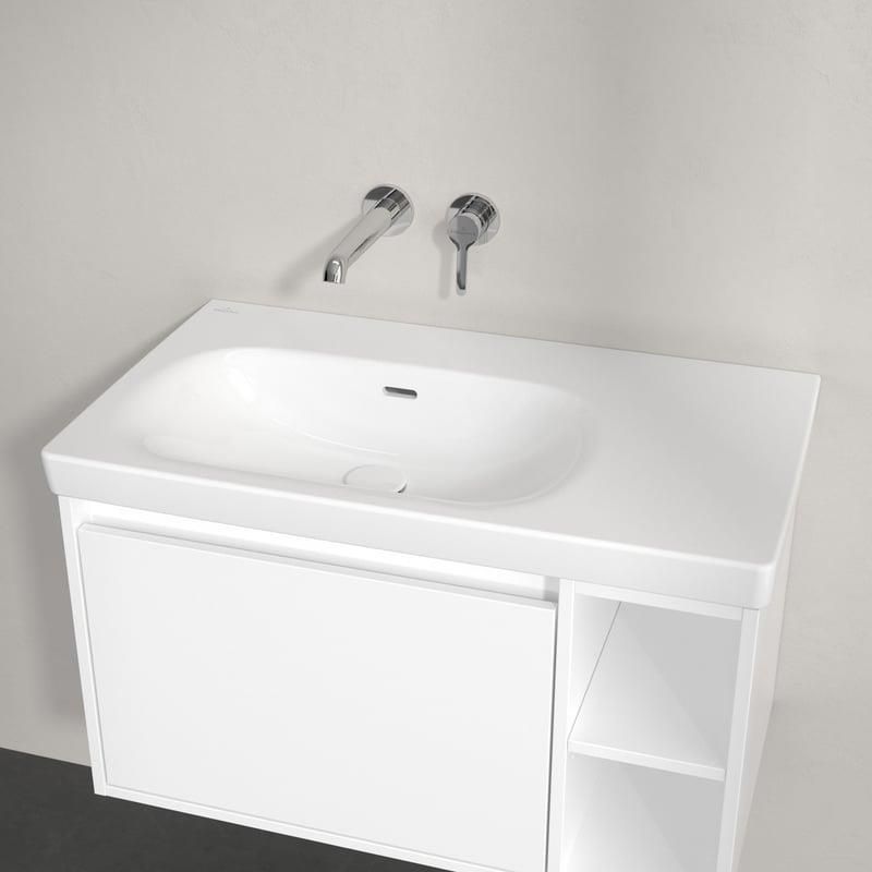 Umywalka ścienna Villeroy & Boch Skyla o szerokości 80 cm w wersji bez otworu na baterię to idealne rozwiązanie do montażu z bateriami umywalkowymi ściennymi – zobacz naszą ofertę. . Wykonana z nowoczesnej ceramiki sanitarnej TitanCeram i pokryta powłoką CeramicPlus, zachwyca subtelnym wzornictwem softcube z cienkimi, precyzyjnymi ściankami, a przy tym wyróżnia się wyjątkową trwałością. Powłoka CeramicPlus sprawia, że woda i zabrudzenia spływają szybciej, co ułatwia utrzymanie czystości i ogranicza powstawanie kamienia. Misa po lewej stronie, wbudowany przelew oraz nieszlifowany spód czynią ten model funkcjonalnym i estetycznym wyborem do nowoczesnych łazienek. Brak otworu na baterię pozwala na stworzenie spójnej, minimalistycznej aranżacji z armaturą ścienną. Model 5A52L3R1 montowany jest bezpośrednio na ścianie i może być łączony z dedykowanymi szafkami z serii Skyla (dostępne w sekcji Pasujące produkty). Akcesoria montażowe należy zamówić osobno. Dowiedz się, jak dobrać baterię ścienną do umywalki. Poznaj więcej o zaletach powłoki CeramicPlus w naszym artykule „Powłoka CeramicPlus – co warto wiedzieć?”. Czystość bez wysiłku: Jak powłoka CeramicPlus ułatwia życie! Jaki syfon do jakiej umywalki? Praktyczny poradnik instalatora.