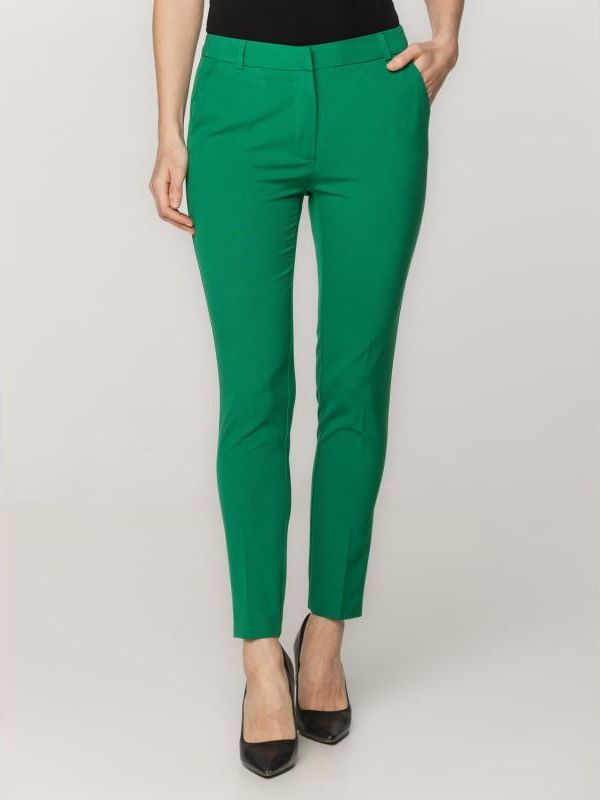 Zielone, klasyczne spodnie garniturowe o gładkiej fakturze z zaprasowanymi kantami i zwężanymi nogawkami