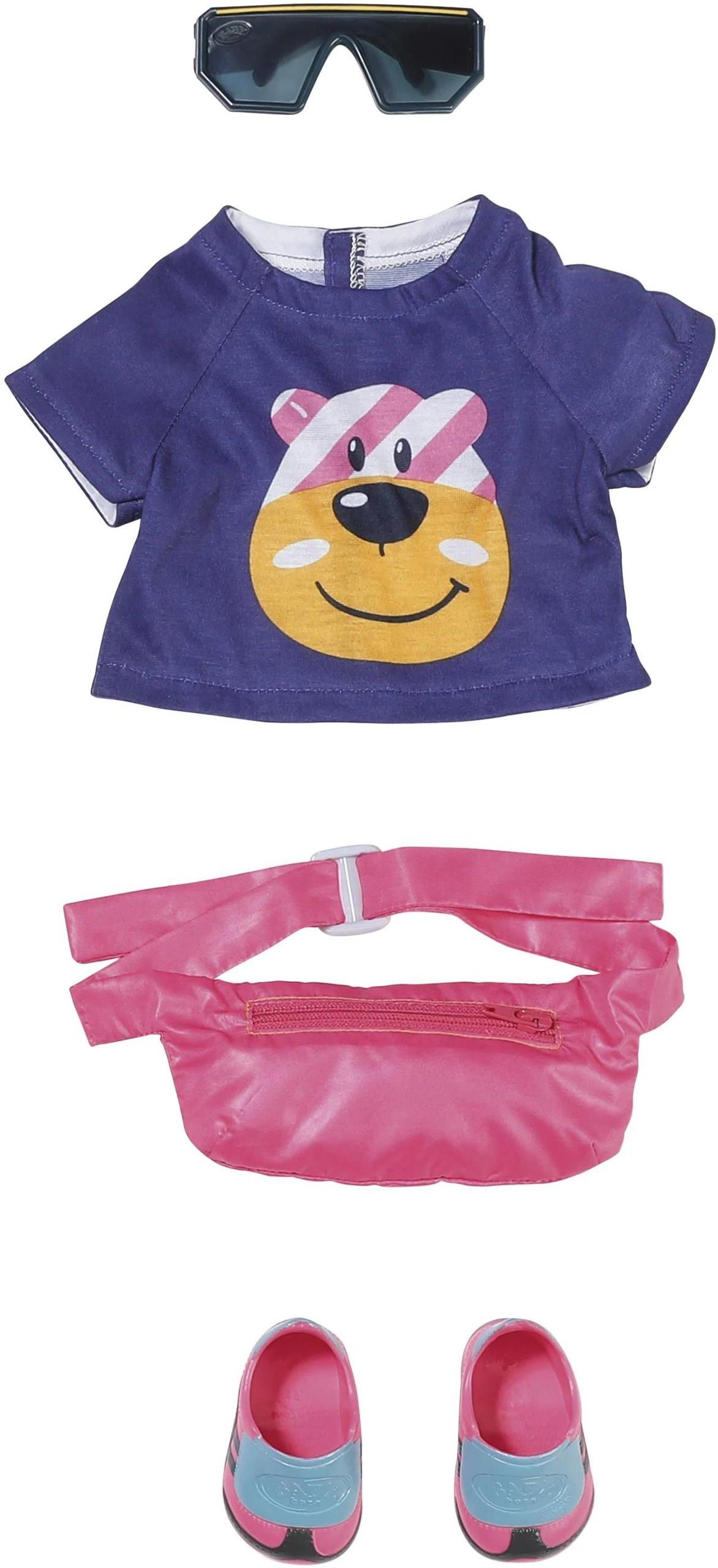 Dzięki tym nowym akcesoriom rowerowym BABY born jest gotowy na kolejną wycieczkę rowerową. Teraz BABY born może pedałować jeszcze mocniej dzięki nowym butom rowerowym z antypoślizgowymi podeszwami. Poręczna różowa torba na pasek jest idealnie dopasowana do jej stylowych okularów przeciwsłonecznych i uroczej zapasowej koszulki - na wypadek, gdyby przypadkowo kapnęła na nią odrobina lodów podczas przerwy. - Wysokiej jakości ubranka dla lalki marki BABY born - Dla lepszej, zróżnicowanej i długotrwałej zabawy podczas gry - Bardzo łatwe do zakładania i zdejmowania Akcesoria rowerowe BABY born 43 cm z koszulą, butami, paskiem i okularami przeciwsłonecznymi.