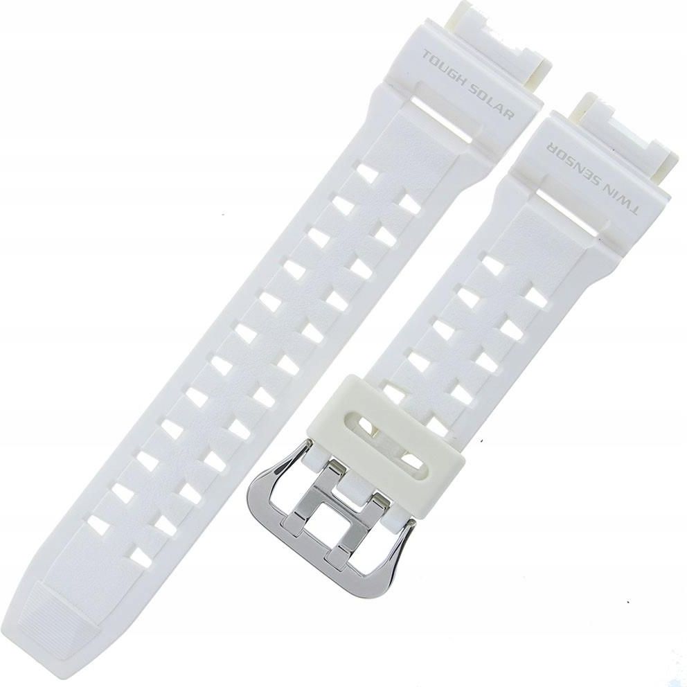 Pasek CASIO 10311631 - GW-9200 / GW-9200PJ-7 Materiał: Tworzywo sztuczne Kolor paska: Biały Kolor zapięcia: Srebrny Szerokość paska: przy kopercie - 26mm przy mocowaniu - 16mm przy klamerce - 21mm Długość paska: część krótsza - 75mm część dłuższa - 135mm Pasek pasuje do wszystkich zegarków CASIO z …