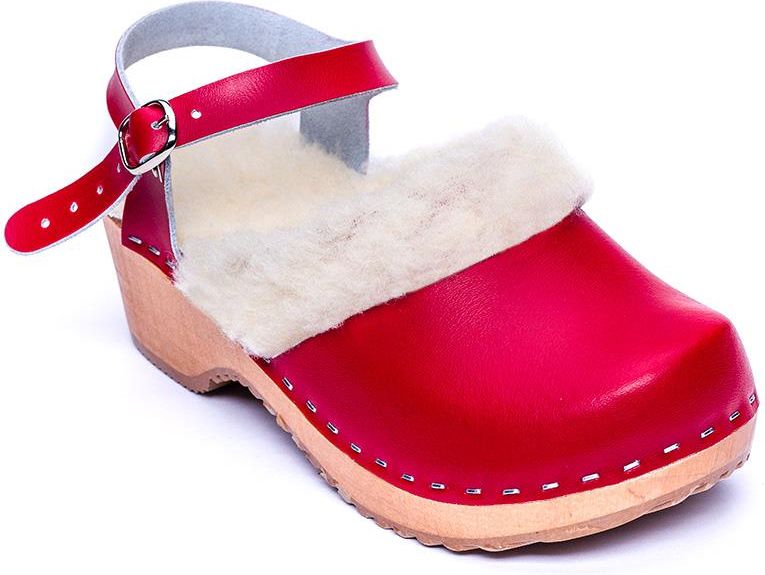 Chodaki dzieciece z ocieplaczem, zapięciem na pietę. Skóra bydlęca kolor czerwony, spód drewno topola