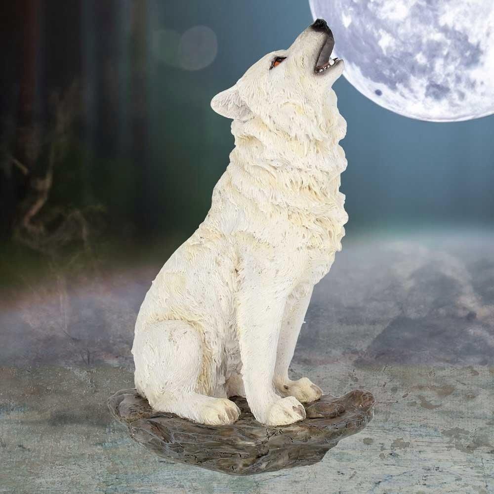 Ta czarująca figurka wilka wprowadzi dzikość do każdego domu. Siedząc na skalnym urwisku, ten imponujący biały wilk wpatruje się w niebo dzikimi, pomarańczowymi oczami, nawołując swoje stado. Jego spojrzenie zdradza nadprzyrodzoną inteligencję i mądrość, sygnalizując, że to nie jest zwykły wilk. Odlana z najwyższej jakości żywicy i starannie ręcznie malowana, ta figurka jest idealna dla każdego, kto czuje zew dziczy.