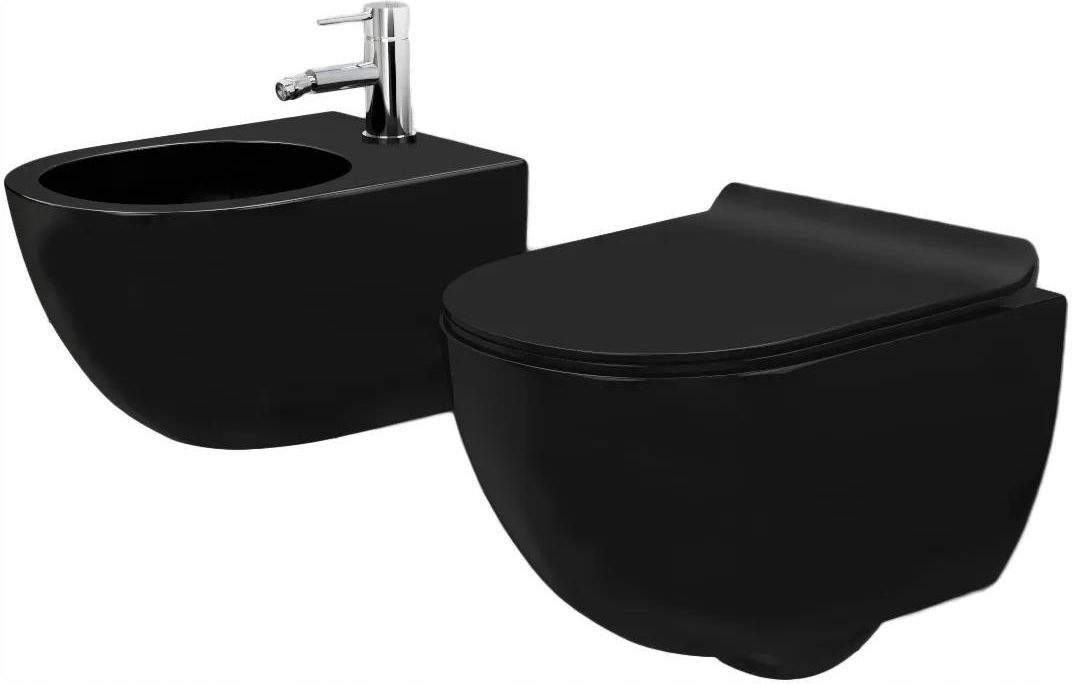 Misa WC Carlo Mini Black Mat Rimless + Deska wolnoopadająca Flat z duroplastu Typ misy: Podwieszana Rimless Kolor: Czarny matowy Wysokość: 32 cm Szerokość: 37 cm Długość: 49,5 cm Materiał: Ceramika sanitarna Rozstaw otworów: 18 cm (pasuje do większości stelaży podtynkowych Sanit, Grohe, Rea itd) Materiał deski: Duroplast Flat Rodzaj deski: Wolnoopadająca Łatwa w montażu Bidet CARLO Mini Black Mat Materiał: Ceramika sanitarna Typ misy: Podwieszana Kolor: Śnieżnobiały Wysokość: 32,5 cm Szerokość: 37 cm Długość: 49,5 cm Rozstaw otworów na śruby montażowe: 18 cm Zestaw montażowy w zestawie Opis oferowanego zestawu Prezentujemy Państwu piękny i niezwykle funkcjonalny podwieszany zestaw misy i bidetu. Jest to idealne połączenie, które w doskonały sposób wypełni Państwa przestrzeń łazienkową zachowując nienaganny wygląd i estetykę wnętrza. Misa oraz bidet są przystosowane do montażu na stelażu podtynkowym. Nasze produkty zostały wykonane z wysokiej jakości ceramiki sanitarnej. Zastosowanie techniki bezrantowej RIMLESS SYSTEM łatwa utrzymanie czystości, a dzięki specjalnej fazie produkcji oferowany zestaw jest niezwykle trwały. Odpowiednie stelaże oraz baterie bidetowe znajdą państwo w ofercie naszego sklepu. RIMLESS SYSTEM Innowacyjny system RIMLESS którego użyliśmy przy produkcji naszych mis WC jest odpowiedzią na wszystkie Państwa dotychczasowe problemy związane z utrzymaniem higieny w łazience. System ten wyeliminował dotychczasowy rant wewnątrz komory spłukiwania przez co wnętrze misy WC nie posiada żadnych ostrych rantów ani zakamarków, więc wszelkie zanieczyszczenia i bakterie nie mają miejsc w których mogłyby się zagnieździć. Misa WC CARLO Mini Black Mat Bidet CARLO Mini Black Mat