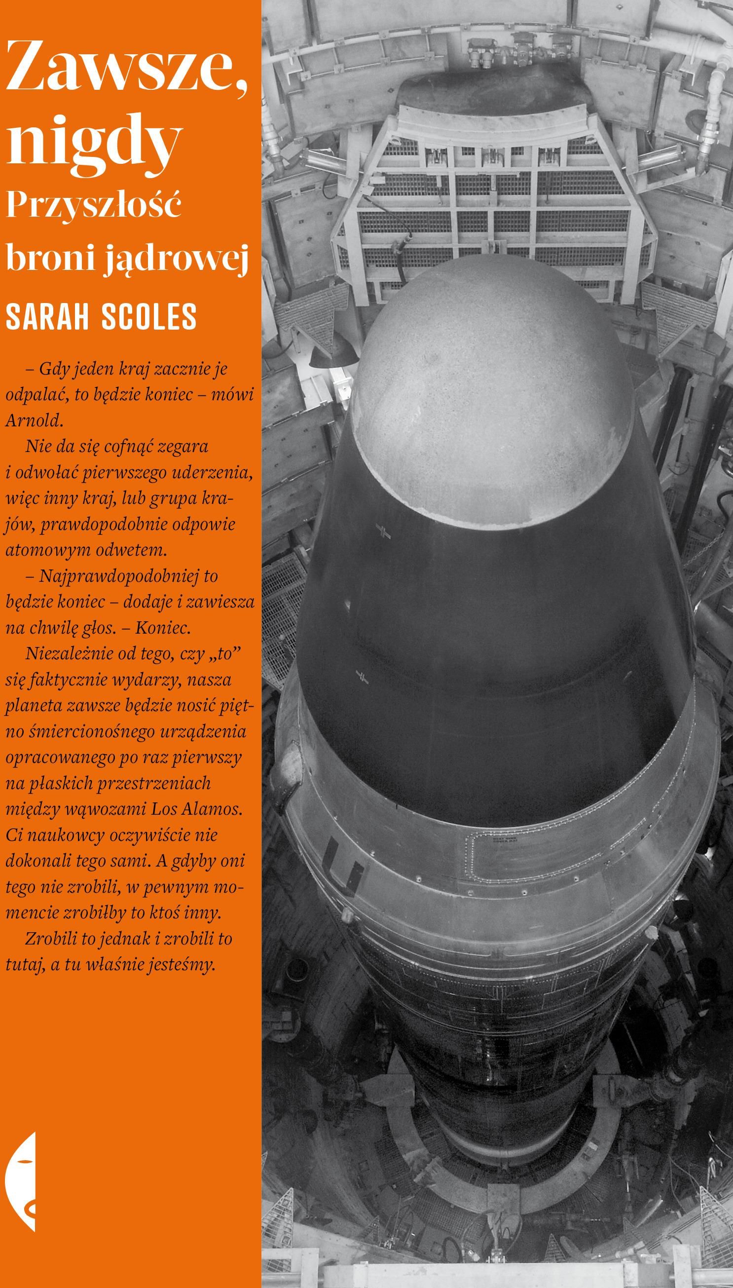 Wielu z nas wydawało się, że po zakończeniu zimnej wojny temat bomby atomowej i nuklearnego wyścigu zbrojeń zszedł na dalszy plan. W USA zaprzestano prób jądrowych, a międzynarodowe traktaty spowodowały, że w amerykańskich laboratoriach nie tworzono już nowych rodzajów tej broni. Jednocześnie przedstawiciele rządu Stanów Zjednoczonych, jak i fizycy jądrowi, pracujący nad spuścizną Projektu Manhattan, zdawali sobie sprawę, że by doktryna odstraszania wciąż mogła działać, arsenał nuklearny nie może być przestarzały. To podejście znajduje odzwierciedlenie w zasadzie „zawsze, nigdy” – bomby mają zawsze wybuchać wtedy, kiedy powinny wybuchnąć, i nigdy wtedy, kiedy wybuchnąć nie powinny. Gdy naukowiec z któregoś z amerykańskich laboratoriów narodowych używa określeń „bezpieczny, pewny i niezawodny”, nie mówi o pożądanych cechach samochodu, lecz o broni termojądrowej. Po inwazji Rosji na Ukrainę, gdy widmo nuklearnego konfliktu nagle powróciło, kwestie dotyczące modernizacji arsenału i skutecznego wykrywania nielegalnych prób jądrowych znów zyskały na aktualności. Sarah Scoles nie straszy nas jednak wizją nadchodzącej wojny atomowej. Rozmawia z amerykańskimi naukowcami, którzy zajmują się konserwacją i modernizacją bomb, by pokazać, że broń jądrowa istnieje i prawdopodobnie nadal będzie istnieć, a ktoś musi nad nią pracować. Bo największym paradoksem amerykańskiego arsenału nuklearnego jest to, że powstał po to, by – po Hiroszimie i Nagasaki – nie musiał być użyty nigdy więcej. „Wszystko, co kiedykolwiek chcieliście wiedzieć o amerykańskiej broni jądrowej.” „Kirkus Reviews” „Scoles umiejętnie opisuje napięcia między dwoma obozami naukowców zajmujących się bronią jądrową, kreśląc ich pełne niuansów portrety [...]. Końcowa analiza jest równie wyważona i sugeruje, że modernizowanie amerykańskiej broni jądrowej prawdopodobnie rzeczywiście zniechęca inne kraje do wykorzystywania swojego arsenału nuklearnego, nawet jeśli grozi to „podsycaniem niekończącego się wyścigu zbrojeń”. Czytelnicy opowiadający się w tej debacie po jednej lub po drugiej stronie znajdą sporo materiału do przemyśleń.” „Publishers Weekly” „To niesłychanie wnikliwy reportaż dotyczący wszystkich praktycznych kwestii związanych z bronią jądrową. Sarah Scoles barwnie pisze o Los Alamos i ludziach, którzy na co dzień pracują w laboratoriach zbrojeniowych.” Kai Bird Zawsze, nigdy. Przyszłość broni jądrowej „Zawsze, nigdy. Przyszłość broni jądrowej” autorstwa Sarah Scoles to wnikliwa analiza współczesnych wyzwań związanych z bronią jądrową, która ukazuje, jak temat ten, mimo zakończenia zimnej wojny, wciąż pozostaje aktualny i istotny dla globalnego bezpieczeństwa. Dla kogo jest ta książka? Osoby zainteresowane historią i współczesnością broni jądrowej Studenci i badacze zajmujący się naukami politycznymi i bezpieczeństwa międzynarodowego Miłośnicy literatury faktu i reportażu Osoby pragnące zrozumieć dynamikę współczesnych konfliktów zbrojnych Co zyskasz dzięki tej publikacji? Głębsze zrozumienie roli broni jądrowej w dzisiejszym świecie Wgląd w prace amerykańskich naukowców zajmujących się konserwacją i modernizacją arsenału nuklearnego Analizę napięć między różnymi obozami naukowców w kontekście broni jądrowej Perspektywę na to, jak modernizacja broni jądrowej wpływa na globalne bezpieczeństwo Kluczowe tematy i obszary Historia i współczesność broni jądrowej Doktryna odstraszania i jej znaczenie Prace amerykańskich laboratoriów jądrowych Wyzwania związane z nielegalnymi próbami jądrowymi Paradoksy związane z arsenałem nuklearnym O Autorce Sarah Scoles to uznana dziennikarka i autorka, która specjalizuje się w tematyce naukowej i technologicznej. Jej prace często koncentrują się na złożonych zagadnieniach związanych z bezpieczeństwem i nowoczesnymi technologiami. O Wydawcy Wydawnictwo Czarne to renomowane polskie wydawnictwo, które specjalizuje się w literaturze faktu, reportażu oraz książkach o tematyce społecznej i politycznej. Dzięki starannie dobranym publikacjom, Wydawnictwo Czarne zdobyło uznanie wśród czytelników i krytyków. Producent/osoba odpowiedzialna za bezpieczeństwo produktuWydawnictwo Czarne sp. z o. o.Wołowiec 1138-307 Sękowaredakcja@czarne.com.pl515 274 298
