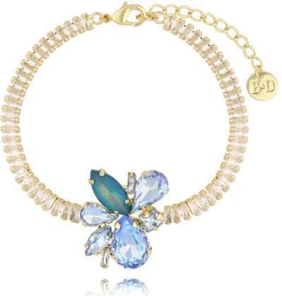 Surowiec: mosiądz. Elementy: wysokiej jakości kryształki. Kolor surowca: złoty. Kolor kryształków: niebieskie, transparentne. Szerokość bransoletki: 0,48 cm. Wielkość elementu: 2,30 cm x 2,75 cm. Długość: 17,5 cm + 3 cm łańcuszek przedłużający.