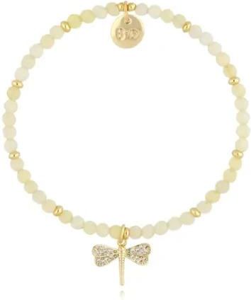 Bransoletka By Dziubeka BTW3116 z zawieszką w kształcie motylka. Surowiec: mosiądz. Kolor surowca: złoty. Kamienie: jadeity barwione. Wielkość kamieni: 0,34 cm. Zawieszka: 1,44 cm x 1,04 cm. Średnica bransoletki: 5,20 cm bez rozciągania gumki.
