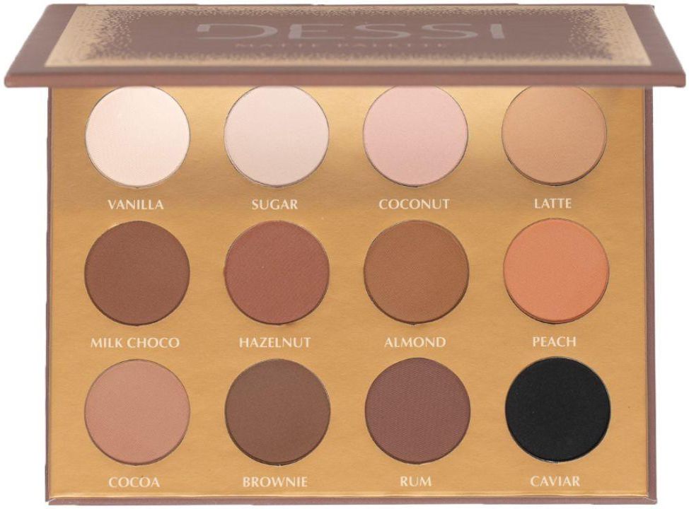 DESSI - MATTE PALETTE - Matowa paletka 12 cieni - 20 g MATTE PALETTE marki DESSI. Paletka cieni. Składa się z 12 prasowanych pudrów o matowym wykończeniu. Harmonijnie dobrana paleta barw w odcieniach klasycznych brązów i beży, pozwoli na stworzenie wielu niesamowitych i kreatywnych makijaży, na co dzień, do pracy, a nawet na wieczorne wyjście. Intensywna pigmentacja sprawia, iż wystarczy niewielka ilość produktu, by osiągnąć mocny efekt. Cienie pięknie się ze sobą łączą oraz blendują na powiece. Podczas nakładania może wystąpić lekki osyp, co jest rzeczą naturalną przy tak intensywnej pigmentacji. Całość została umieszczona w solidnej tekturowej palecie z lusterkiem pod pokrywą zamykającą. Paleta cieni. Ma matowe wykończenie. Jest intensywnie napigmentowana. Składa się z 12 odcieni w klasycznych kolorach. POSZCZEGÓLNE ODCIENIE:- Vanilla - jasny waniliowy, - Sugar - cielisto-beżowy z nutą różu,- Coconut - jasny róż z nutą brzoskwini, - Latte - jasny brązowo-szary, - Milk Choco - ciepły, czekoladowy brąz,- Hazelnut - ciepły orzechowy brąz,- Almond - średni, ciepły brąz z nutą miodu, - Peach - brzoskwiniowy z nutą pomarańczu, - Cocoa - jasny kakaowy, - Brownie - chłodny, ciemny brąz, - Rum - brąz z nutą fioletu, - Caviar - czarny. Atrybuty Waga netto - 20 g Wymiary zamkniętej palety - 15,5 cm x 11,8 cm x 1,3 cm PAO termin trwałości - 18M