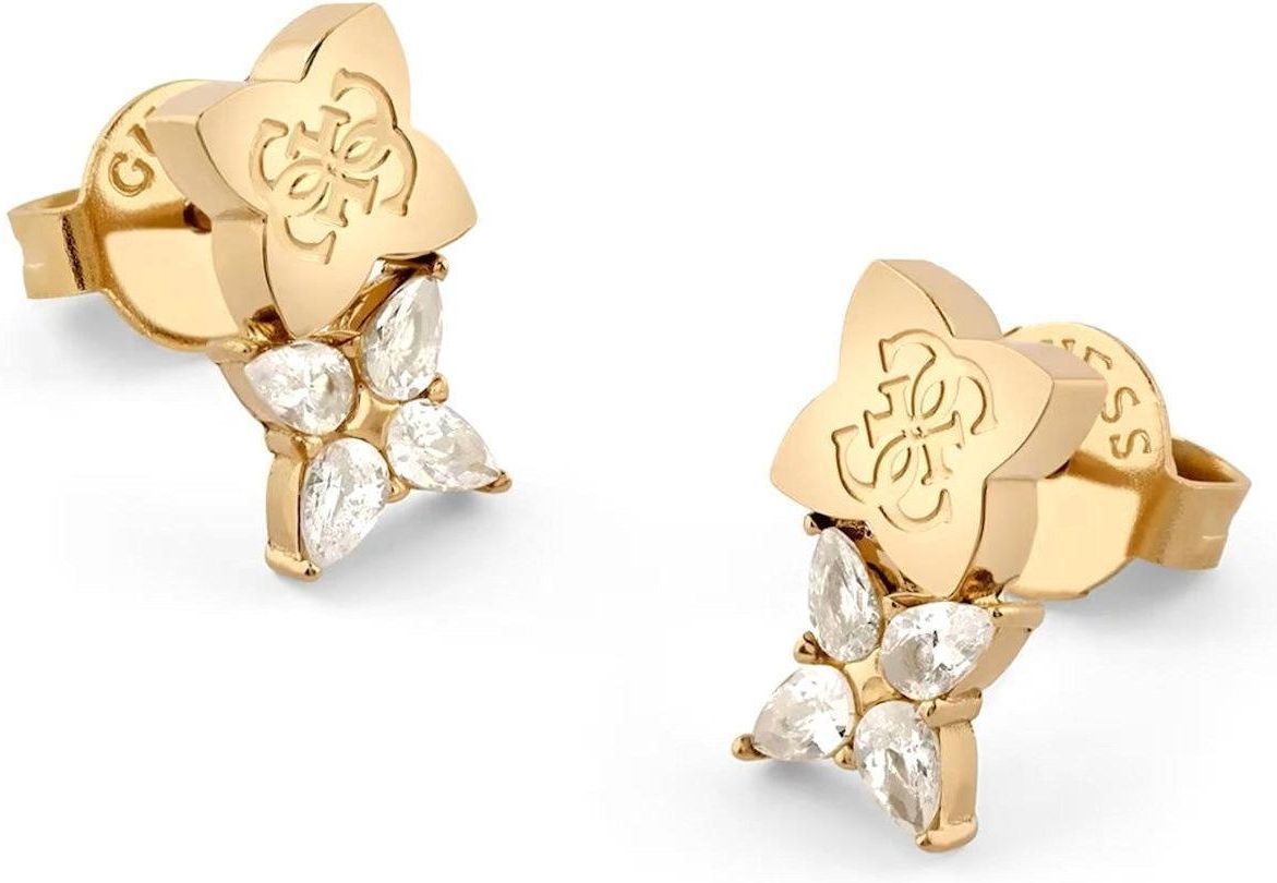 Damskie eleganckie platerowane pozłacane wysadzane cyrkoniami stalowe kolczyki Guess w kształcie kwiatu. Kolekcja Wild Flower. Złocenie w kolorze żółtego złota. Zapięcie na sztyft