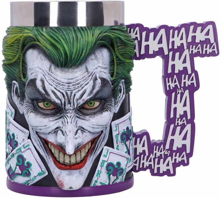 Pokaż swoją niezachwianą wierność Księciu Zbrodni z tym oficjalnie licencjonowanym kuflem Joker. Z twarzą Jokera wyłaniającą się z przodu i z tyłu kufla, nie ma ucieczki od jego psychotycznego spojrzenia i złego uśmiechu. Wyłaniający się z boku kufla, uchwyt został ukształtowany w literę "J", pokryty "HA HA HA" reprezentuje sadystyczne poczucie humoru Jokera w całej serii komiksów. Odlany z wysokiej jakości żywicy przed starannym ręcznym malowaniem, ten kawałek jest obowiązkowym dodatkiem do każdej kolekcji fanów komiksów bądź wielbicieli uniwersum DC. Kufel jest bezpieczny w kontakcie z żywnością, ale ma głównie dekoracyjny charakter i nie jest przeznaczony do gorących napojów. Kufel wykonany został z żywicy (podstawa), oraz nierdzewnej stali (wstawka). Wysokość około 15,5 cm. Nie można myć w zmywarce i nie wolno używać w mikrofalówce.