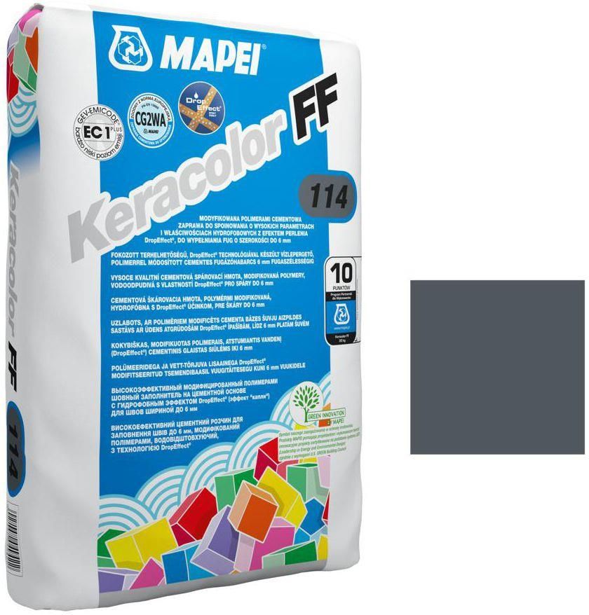 Spoina MAPEI KERACOLOR FF 20kg - kolor 114 antracyt Keracolor FF to zaprawa cementowa do spoinowania płytek ceramicznych i kamienia naturalnego o podwyższonych parametrach i właściwościach hydrofobowych z efektem perlenia DropEffect®, do wypełniania szczelin o szerokości do 6 mm. ZAKRES STOSOWANIA …