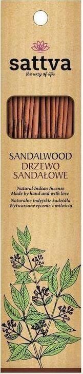 Słowo sattva oznacza dobro, pozytywność, prawdę, zdrowie, pogodność, holistyczne spojrzenie na świat, twórczość, konstruktywność, równowagę, pewność, pokój, czystość, wewnętrzną potrzebę Dharmy i Jana (wiedzy). Drzewo sandałowe znane jest w już od tysiącleci, a jego uzdrawiające właściwości wykorzystuje się w medycynie indyjskiej i chińskiej do dziś. W Indiach używany jest w celach duchowych i mistycznych. Dzięki swoim właściwościom poprawiającym samopoczucie, rozjaśniającym koncentrację i świadomość (stymuluje aktywność szyszynki) często używany jest do medytacji i w różnych indyjskich obrzędach. Balsamiczny, ciepły zapach drzewa sandałowego delikatnie uspokaja i pomaga w relaksie, a oprócz tego ułatwia zasypianie. Kadzidła wytwarzane są z esencji kwiatów, ziół, drewna, żywic roślinnych i miodu. Ręcznie zwijane na bambusa. To kadzidło wytwarzane jest ręcznie z 400 letnią tradycją. Nie zawiera syntetycznego zapachu, składników ani produktów petrochemicznych. Sposób użycia: Zapal kadzidełko małym płomieniem. Zdmuchnij płomień. Kadzidło będzie się tlić przez 60-70 minut. Zawartość: 15 patyczków – 30g