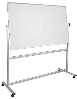 Dwustronna biała tablica o powierzchni suchościeralnej z właściwościami magnetycznymi pozwala na przyczepianie arkuszy czy zdjęć za pomocą magnesów. Tablica obraca się wokół osi poziomej, można ją zatrzymać w dowolnym momencie dzięki grafitowemu pokrętłu. Rama tablicy wykonana jest z aluminium i wykończona została popielatymi narożnikami. Mobilna aluminiowa konstrukcja tablicy jest bardzo wytrzymała i stabilna. Pozwala na bezproblemowe przemieszczanie produktu. Kółka wyposażone zostały w hamulec. - Wymiary powierzchni tablicy: 150 x 100cm - Wysokość: 185 cm - stała - Powierzchnia ceramiczna, suchościeralno-magnetyczna - Gwarancja: 2 lata na produkt, dożywotnia na powierzchnię