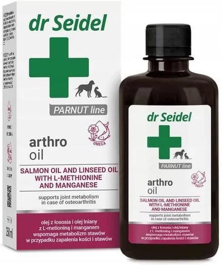 DR SEIDEL Arthro Oil to specjalistyczny preparat stworzony z myślą o wsparciu metabolizmu stawów w przypadku zapalenia kości i stawów. Wyjątkowa formuła, oparta na połączeniu oleju z łososia i oleju lnianego, dostarcza niezbędnych nienasyconych kwasów tłuszczowych omega-3 i omega-6, które mogą działać przeciwzapalnie i wspomagają regenerację stawów. Dzięki dodatkom takim jak L-metionina, mangan i chondroityna, produkt nie tylko łagodzi ból, ale także wspiera zdolność stawów do naprawy i utrzymania pełnej funkcjonalności. DR SEIDEL Arthro Oil – wsparcie dla stawów w regeneracji i ochronie przed stanami zapalnymi DR SEIDEL Arthro Oil to olej wspomagający metabolizm stawów, który został opracowany z myślą o psach i kotach cierpiących na zapalenie kości i stawów oraz innych problemach związanych z zaburzeniami metabolizmu stawów. Olej z łososia i olej lniany, bogate w DHA i EPA, stymulują naturalne mechanizmy obronne organizmu, chroniąc stawy przed procesami zapalnymi. Dodatkowo, mangan i chondroityna wspomagają tworzenie zdrowych kości i chrząstki, zwiększając ich odporność na mikrouszkodzenia i poprawiając mobilność zwierzęcia. Kluczowe korzyści zdrowotne Redukcja stanów zapalnych: Omega-3 i omega-6 łagodzą stany zapalne kości i stawów, wspierając ich regenerację. Wsparcie metabolizmu stawów: Chondroityna i mangan zwiększają wytrzymałość i sprawność stawów, chroniąc przed mikrouszkodzeniami. Poprawa ogólnej kondycji organizmu: L-metionina wspiera regenerację skóry, paznokci i tkanki łącznej, zmniejszając ból stawów. Zapobieganie chorobom stawów: Regularne stosowanie pomaga chronić zwierzę przed chorobami zwyrodnieniowymi i nowotworowymi. Kiedy warto rozpocząć stosowanie? DR SEIDEL Arthro Oil zaleca się stosować u psów i kotów cierpiących na zapalenie kości i stawów lub inne zaburzenia metabolizmu stawów. Idealny dla zwierząt starszych, ras predysponowanych do problemów ze stawami (np. owczarek niemiecki, bernardyn), a także zwierząt aktywnych, pracujących lub o dużej wadze. Profilaktycznie warto włączyć olej do diety, aby wspierać zdrowie stawów i kości już od młodego wieku. Dlaczego warto kupić DR SEIDEL Arthro Oil? DR SEIDEL Arthro Oil to kompleksowe wsparcie dla zdrowia stawów i kości Twojego pupila. Dzięki połączeniu najwyższej jakości składników, takich jak olej z łososia, olej lniany, mangan i chondroityna, produkt może działać przeciwzapalnie, wspiera regenerację stawów i poprawia ich funkcjonalność. Regularne stosowanie oleju może pomóc w łagodzeniu bólu, poprawie mobilności oraz zapobieganiu chorobom zwyrodnieniowym. Olej jest łatwy w podawaniu – można go mieszać z karmą, co czyni go wygodnym rozwiązaniem dla właścicieli, dbających o zdrowie swoich zwierząt. Ciekawostka na temat kwasów omega-3 Kwasy tłuszczowe omega-3, obecne w Dr Seidel Arthro Oil, nie tylko wspierają zdrowie stawów, ale także wpływają na funkcje poznawcze zwierząt. Badania wykazały, że regularne stosowanie omega-3 może poprawić pamięć i zdolności uczenia się u starszych psów, co czyni ten składnik nieocenionym wsparciem dla zdrowia ogólnego.