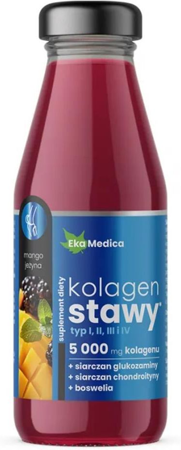 Kolagen Stawy – funkcjonalne smoothie 250 ml Kolagen Stawy to suplement diety w formie płynnego smoothie, który wspiera prawidłowe funkcjonowanie kości, chrząstki i stawów. Zawiera aż cztery typy kolagenu (I, II, III i IV), a jego formuła została wzbogacona o glukozaminę, chondroitynę, kwas hialuronowy, boswellię i witaminę C. Dzięki temu produkt działa kompleksowo, łącząc składniki znane z korzystnego wpływu na zdrowie układu ruchu. Dlaczego warto wybrać Kolagen Stawy? Kompleks kolagenowy – hydrolizat kolagenu wołowego w ilości 5000 mg wspiera tkankę chrzęstną i elastyczność stawów. Witamina C – pomaga w prawidłowej produkcji kolagenu, wspierając zdrowie kości i chrząstki. Boswellia serrata – tradycyjnie stosowana roślina, która wspiera ruchomość i komfort stawów. Glukozamina i chondroityna – naturalne składniki chrząstki, wspierające jej regenerację. Hialuronian sodu – pomaga utrzymać odpowiednie nawodnienie stawów i płynność ruchów. Naturalny smak owoców – smoothie powstaje z puree jeżyn i mango oraz soku jabłkowego, bez dodatku cukru (zawiera tylko naturalnie występujące cukry). Wartości odżywcze i składniki aktywne (w butelce 250 ml) Składniki w porcji dziennej 250 ml: sok jabłkowy z zagęszczonego soku jabłkowego, puree z owoców jeżyny (20%), puree z owoców mango (20%), hydrolizat kolagenu wołowego – 5000 mg, koncentrat soku z czarnej marchwi, siarczan glukozaminy – 500 mg, regulator kwasowości: kwas cytrynowy, witamina C (kwas L-askorbinowy) – 80 mg (100% RWS*), siarczan chondroityny – 100 mg, hialuronian sodu – 50 mg, ekstrakt z owoców gorzkiej pomarańczy (Citrus aurantium) – 15 mg, w tym bioflawonoidy – 6,8 mg, ekstrakt z żywicy kadzidłowca indyjskiego 9-10:1 (Boswellia serrata) – 15 mg. *Referencyjna wartość spożycia dla przeciętnej osoby dorosłej (8400 kJ/2000 kcal) Dodatkowe informacje Zalecana porcja do spożycia: Jedna butelka (250 ml) dziennie. Nie przekraczać zalecanej porcji do spożycia w ciągu dnia. Suplement diety nie może być stosowany jako substytut (zamiennik) zróżnicowanej diety. Osad i rozwarstwienie produktu są zjawiskiem naturalnym. Przed spożyciem wstrząsnąć. Barwa, smak i aromat produktu mogą różnić się w zależności od danej partii. Opakowanie zawiera 1 zalecaną porcję dzienną. Ostrzeżenia: Nie stosować w przypadku nadwrażliwości na którykolwiek ze składników produktu. Kobiety w ciąży oraz w okresie karmienia piersią przed zastosowaniem powinny skonsultować się z lekarzem. Sposób przechowywania: Po otwarciu przechowywać w lodówce. Spożyć do 2 dni od otwarcia. Przechowywać w sposób niedostępny dla małych dzieci. Chronić przed bezpośrednim działaniem promieni słonecznych. Producent: EkaMedica