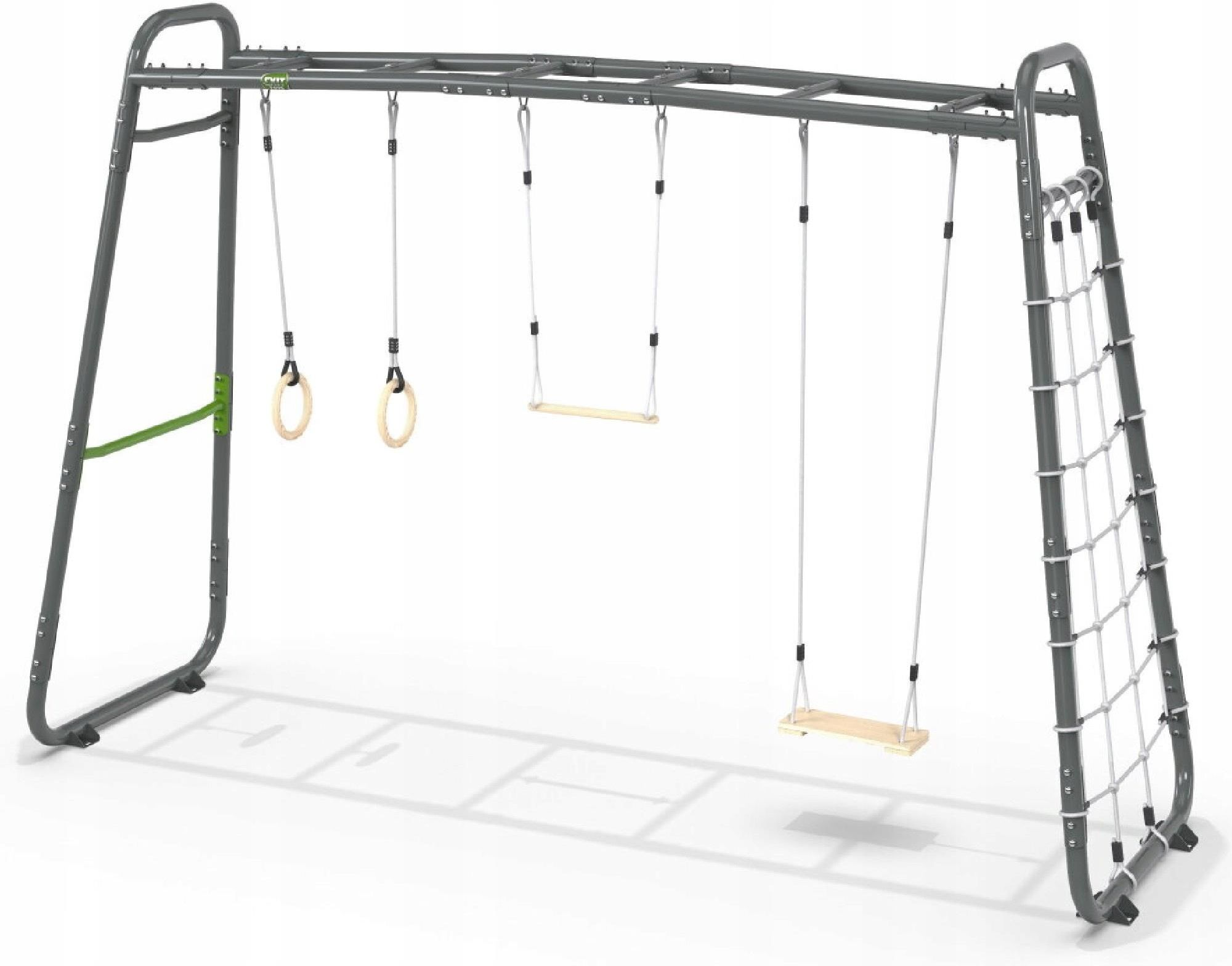Exit Plac zabaw ogrodowy Drążki gimnastyczne GetSet MB310 Małpi gaj: poręcze, pozioma drabinka, drążek, kółka, huśtawka, trapez, siatka do wspinaczki Został stworzony przez holenderską markę Exit Toys która produkuje zabawki i wysokiej jakości sprzęty outdoorowe. W ofercie znajdują się m.in. trampoliny, baseny, drewniane place zabaw i gokarty. EXIT GetSet MB310 to kompletny zestaw sprzętu do aktywności na świeżym powietrzu o długości prawie 4 metrów. W zestawie znajdują się różnorodne akcesoria, takie jak drążek, drewniane kółka gimnastyczne, huśtawka, trapez i siatka wspinaczkowa. To wielofunkcyjne urządzenie oferuje rozrywkę oraz aktywność fizyczną dla dzieci, nastolatków i osób dorosłych w różnym wieku. Zawartość zestawu Rama ze stali - solidna konstrukcja zapewniająca stabilność i wytrzymałość. Drążek - do wzmacniania mięśni pleców, ramion oraz mięśni brzucha. Kółka gimnastyczne drewniane z regulacją wysokości - umożliwiające różnorodne ćwiczenia, takie jak unoszenie nóg czy ćwiczenie równowagi. Huśtawka drewniana - zapewnia dodatkową zabawę dla dzieci, pozwalając im cieszyć się ruchem na świeżym powietrzu. Trapez drewniany - idealny do wzmacniania mięśni pleców, ramion oraz mięśni brzucha. Siatka wspinaczkowa - zapewnia wyzwanie dla dzieci, rozwijając ich sprawność fizyczną i umiejętności koordynacyjne. 6 haków - do zawieszenia akcesoriów. Zestaw mocujący - kotwy gruntowe x4. Wyzwania dla każdego Urządzenie zapewnia wiele zabawy i możliwości ćwiczenia na zewnątrz. Dzieci mogą używać go do wspinaczki i swobodnie bujać się na drążkach. Podczas tego ćwiczenia rozwijają koordynację, korzystając ze świeżego powietrza. Dorośli mogą ćwiczyć różne grupy mięśni, na przykład mięśnie ramion, pleców i barków. Wieszając się na jednym drążku jedną ręką i następnie chwytając drugi drugą ręką przemieszczasz się pod urządzeniem, co stanowi wyzwanie zarówno dla młodszych, jak i starszych! Dostosuj do swoich potrzeb Istnieje możliwość rozbudowy zestawu poprzez dodatkowe akcesoria EXIT GetSet. Dodatki można zawiesić po wewnętrznej stronie konstrukcji oraz po bokach. Gdy dzieci są jeszcze małe, mogą się świetnie bawić na drewnianej huśtawce, kółkach gimnastycznych i siatce wspinaczkowej. Z pewnością zachęci to dzieci do wspólnej zabawy na świeżym powietrzu. Urządzenie można także wykorzystać do ćwiczeń sportowych. Wystarczy wymienić akcesoria za pomocą prostego systemu mocowania i w mgnieniu oka zamienić urządzenie do zabawy w urządzenie fitness na zewnątrz. Korzystając z ramy i akcesoriów takich jak kółka gimnastyczne, worek treningowy lub stacja do dipów, możesz dowolnie komponować własne ćwiczenia. Haczyk do szybkiego zawieszenia Do każdej rączki poziomej drabinki dołączony jest haczyk do zawieszenia. Na tym systemie szybkiego zwalniania z karabińczykiem można zawiesić akcesoria do zabawy i sportu. Wysoka jakość i bezpieczeństwo Bezpieczeństwo i trwałość są priorytetem, co ukazuje solidna i stabilna konstrukcja urządzenia. Rama jest ocynkowana i malowana proszkowo, co zapewnia ochronę przed rdzą i gwarantuje długą żywotność. Dodatkowo, plastikowe elementy łączące zapewniają cichą i płynną pracę, eliminując odgłosy skrzypienia. Montaż urządzenia jest prosty dzięki szczegółowym instrukcjom krok po kroku. Solidne zakotwiczenie ramy w betonie tworzy stabilny fundament, co jest kluczowe dla bezpieczeństwa podczas intensywnego treningu lub w trudnych warunkach atmosferycznych. Produkt posiada certyfikaty CE i TÜV. Dzięki temu zestawowi do ćwiczeń każdy może cieszyć się aktywnością fizyczną na świeżym powietrzu, niezależnie od wieku czy poziomu sprawności fizycznej. Jest to idealne rozwiązanie dla osób pragnących prowadzić aktywny tryb życia i czerpać radość z treningu we własnym ogrodzie. Do zakupionego produktu istnieje możliwość zamówienia części zamiennych lub dodatkowych akcesoriów bezpośrednio ze strony producenta: https://www.exittoys.nl/onderdelen Informacje szczegółowe wymiary po złożeniu: 379 x 248 x 115 cm materiał: stal ocynkowana malowana proszkowo liczba użytkowników: 3 wymiary ramy: ø 60 x 1,5 mm, ø 40 x 1,5 mm zestaw mocujący: 4 kotwy do miękkiego gruntu, wymagane użycie betonu -długość: 60 x 25 x 25 cm -wymiary otworu fundamentowego: 30 x 30 x 40 cm drabinka pozioma: -wymiary: 300 x 51 cm -wysokość od podłoża: 234 cm -liczba uchwytów: 6 -średnica i grubość uchwytów: ⌀ 38 x 1,5 mm 2 drewniane kółka gimnastyczne: -materiał: pierścienie: cedr, taśma: poliester -średnica kółek: ø 19 cm -grubość kółek: 25 mm -regulowana wysokość: minimum: 105 cm, maksimum 150 cm huśtawka: -materiał: siedzisko: cedr, lina: poliester -maksymalna regulowana wysokość: 120 cm trapez: -materiał: siedzisko: drewno, liny: poliester -regulowana wysokość: minimum: 110 cm, maksimum 150 cm sieć wspinaczkowa: -wymiary: 100x210 cm -kolor: jasny szary -materiał: poliester -grubość liny: ø 12 mm drążek: -wymiary: szerokość: 82 cm, grubość: 38 mm -wysokość od podłoża: 102 cm -kolor: zielony maksymalna waga użytkownika dla metalowych części konstrukcji: 100 kg dla akcesoriów drewnianych i z tworzywa sztucznego: 50 kg wiek: 3+ waga: 112 kg kod producenta: 54.30.10.00 ilość paczek: 5 wymiary paczek (cm): 115x68x22, 118x43,5x18 x2, 65x26x7,5, 92x50x35