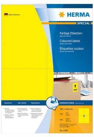 Etykieta uniwersalna HERMA SPECIAL 105 x 148 mm (szer. x wys.) papier żółty 400 etykiet/opak. Wymiary: 105 x 148 mm (szer. x wys.) Arkusz A4 bielona bez chloru Wykonanie klejenia: klejenie trwałe Klej bezrozpuszczalnikowy Drukarka laserowa, kolorowa drukarka laserowa, drukarka atramentowa, …