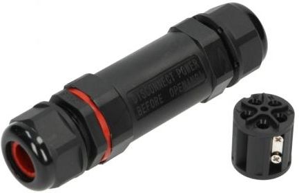 Konektor kablowy, o prostym kształcie i wysokim stopniu szczelności IP68, który gwarantuje zabezpieczenie przed działaniem czynników zewnętrznych. Posiada dobrze dopasowaną uszczelkę bloku łączeniowego oraz grubą gumową uszczelkę przy dławicy, która dokładnie uszczelnia wprowadzone przewody. Materiał użyty do produkcji konektora jest odporny na działanie promieni UV i nadaje się do stosowania na zewnątrz. Styki zostały wykonane z mosiądzu, dodatkowo zabezpieczonego przed utlenianiem warstwą niklu. Informacje ogólne Typ konektora: prosty Ilość przewodów: 5 Średnica kabla: 10-16 mm Przekrój żyły: 6 mm² Napięcie znamionowe: 450V Prąd: 30A Materiał styków: Mosiądz niklowany Materiał obudowy: PoliAmid 6 Obudowa Uniepalniona: tak Klasa Palności Obudowy UL94: V1 Odporność na promieniowanie UV: tak Stopień ochrony: IP68 Wymiary (szer./wys./gł. [mm]): 118 / Ø 30 Rodzaj połączenia: śrubowy