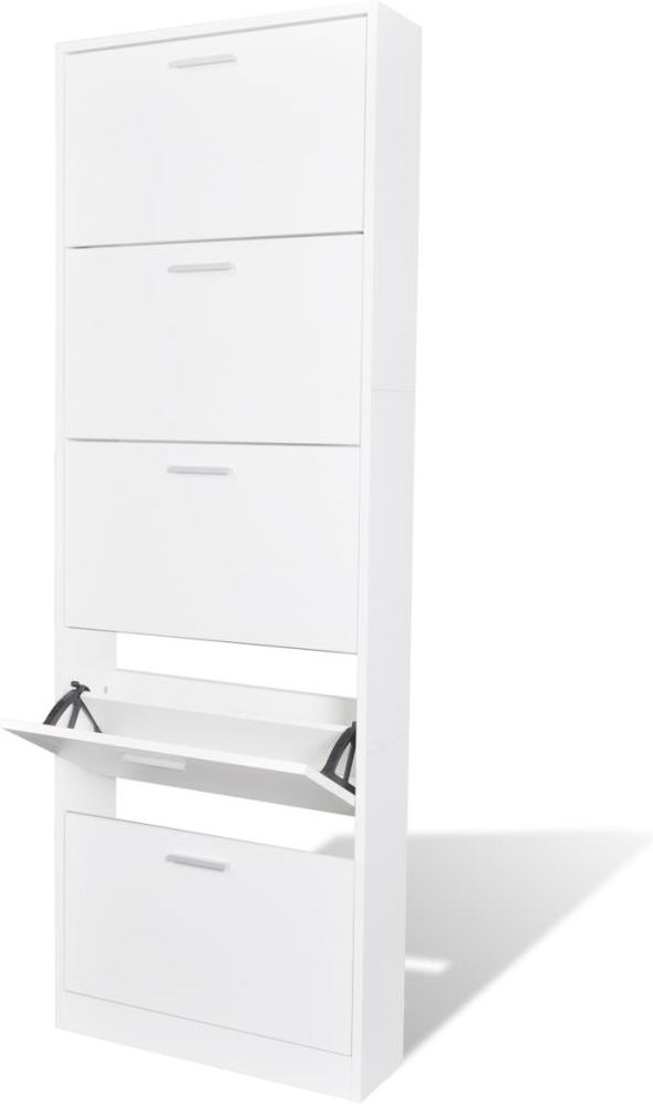 vidaXL Drewniana półka na obuwie z pięcioma przegrodami biała Drewniana półka na obuwie od VidaXL to idealne rozwiązanie do przechowywania butów w sposób uporządkowany i stylowy. Wykonana z wysokiej jakości materiałów drewnopochodnych, dostępna jest w eleganckim, białym kolorze. Mebel ma wymiary 59 …