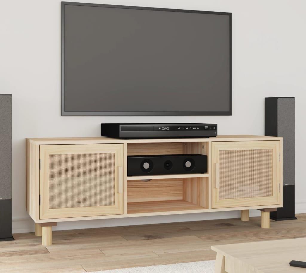 Stolik pod TV, brązowy, 105x30x40 cm, drewno sosnowe i rattan Ta klasyczna szafka pod telewizor stanowi praktyczny i przyciągający wzrok dodatek do Twojego wnętrza. Trwały materiał: tworzywo drewnopochodne ma wyjątkową jakość i gładką powierzchnię, a do tego charakteryzuje się wytrzymałością, stabilnością i odpornością na wilgoć. Dużo miejsca do przechowywania: szafka pod TV z 4 komorami oferuje dużo miejsca do uporządkowania czasopism, płyt DVD i innych przedmiotów. Ponadto naturalny wzór ratanu na drzwiczkach dodaje jej dodatkowego piękna. Nóżki z litego drewna sosnowego: drewniane nóżki nadają szafce pod TV naturalny i przyjemny wygląd, zapewniając jednocześnie stabilność. Mebel ten świetnie komponuje się z każdym wystrojem wnętrza. Solidny blat: na blacie tej szafki możesz postawić swoje ulubione zdjęcia, ozdoby lub kwiaty, aby wzbogacić wystrój wnętrza. Uwaga: Każdy produkt jest dostarczany wraz z instrukcją montażu dla ułatwienia tej czynności. Kolor: brązowy Materiał: materiał drewnopochodny, lite drewno sosnowe, naturalny rattan Wymiary: 105 x 30 x 40 cm (szer. x gł. x wys.) Wewnętrzne wymiary szafki: 32 x 28 x 27 cm (szer. x gł. x wys.) Wewnętrzne wymiary półki: 35 x 27,5 x 13 cm (szer. x gł. x wys.) Maksymalne obciążenie (całkowite): 70 kg Maks. obciążenie półki: 10 kg