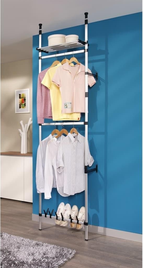 Nasz teleskopowy wieszak na ubrania to idealne rozwiązanie dla osób poszukujących prostego, ale funkcjonalnego systemu do przechowywania ubrań. Dzięki tej konstrukcji zaoszczędzisz miejsce w sypialni lub w dowolnym innym pomieszczeniu. Wykonany z aluminium, nasz teleskopowy system do garderoby jest nie tylko wytrzymały, ale także elegancki. Możesz łatwo dostosować drążki do wieszania do różnych przestrzeni za pomocą systemu teleskopowego i regulacji wysokości. To sprawia, że zapewnia on wyjątkowe i pomysłowe rozwiązanie do uporządkowania Twojej szafy. Zainstaluj nasz teleskopowy system do garderoby i ciesz się porządkiem w swoim pokoju! Kolor: srebrno-czarny Materiał: aluminium, plastik Wymiary: 65 x 40 x 250-300 cm (szer. x gł. x wys.) Głębokość półki: 24 cm Regulowana wysokość: maksymalnie do 3 m Waga netto: 2,02 kg Maksymalne obciążenie: 15 kg Zawiera: 1 regulowaną półkę, 2 górne pręty na ubrania i 1 dolny pręt na 6 par butów Wymagany montaż: tak