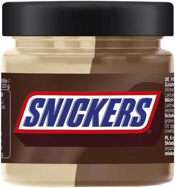 3x Snickers Krem czekoladowy 200g 3x Snickers Krem czekoladowy 200g najważniejsze właściwości intensywny smak czekolady, orzechów ziemnych i karmelu inspirowany batonikiem Snickers aksamitna konsystencja, ułatwiająca rozsmarowywanie na pieczywie czy naleśnikach brak zbędnych dodatków, barwników i wypełniaczy w składzie idealny do codziennego użytku, deserów, wypieków i przekąsek poręczne opakowanie 200g, które sprawdzi się w każdej kuchni Snickers Krem czekoladowy 200g to idealny wybór dla miłośników kultowego batonika Snickers, którzy pragną cieszyć się jego smakiem w nowej formie. Krem wyróżnia się intensywnym połączeniem czekolady, orzechów ziemnych i delikatnej nuty karmelu. To doskonały dodatek do pieczywa, naleśników, gofrów, a także świetna baza do deserów i wypieków, pozwalająca wzbogacić każdą chwilę o znany i lubiany smak. Produkt cechuje się starannie opracowanym składem, pozbawionym zbędnych barwników i wypełniaczy, co podkreśla jego jakość i autentyczność smaku. Krem jest łatwy w rozsmarowywaniu dzięki swojej aksamitnej konsystencji, co sprawia, że codzienne korzystanie z niego staje się wyjątkowo wygodne. Idealny zarówno na szybkie śniadanie, jak i jako słodka przekąska w ciągu dnia. Podsumowując, Snickers Krem czekoladowy 200g to idealny wybór dla tych, którzy kochają smak batonika Snickers w nowej, uniwersalnej formie. Łącząc wysoką jakość składników z wyjątkowym smakiem, produkt ten jest doskonałym dodatkiem do codziennych posiłków i deserów, zapewniając wyjątkowe doznania smakowe. Składniki Składnik - 100 g (%RWS) Wartość energetyczna - 572 kcal (29%) Tłuszcz - 37 g (53%) w tym kwasy nasycone - 9,7 g (49%) Węglowodany - 57 g (22%) w tym cukry - 53 g (59%) Białko - 3 g (6%) Sól - 0,2 g (3%) Cukier, oleje roślinne (rzepakowy, palmowy), mleko pełne w proszku, czekolada mleczna 5% (cukier, tłuszcz kakaowy, odtłuszczone mleko w proszku, masa kakaowa, laktoza i białko serwatki (mleko), tłuszcz palmowy, serwatka w proszku (mleko), tłuszcz mleczny, emulgator (lecytyny sojowe), ekstrakt z wanilii), maltodekstryna, laktoza (mleko), proszek kakaowy o zmniejszonej zawartości tłuszczu, emulgator (lecytyny), naturalny aromat, sól, aromat, ekstrakt z papryki, orzechy laskowe. Produkt może zawierać inne orzechy Sposób użycia Produkt gotowy do spożycia. Przeciwwskazania Produkt nie może być stosowany jako substytut zróżnicowanej diety. Zrównoważony sposób żywienia oraz zdrowy tryb życia są podstawą prawidłowego funkcjonowania organizmu. Nie należy przekraczać zalecanej porcji do spożycia w ciągu dnia. W przypadku stosowania leków lub innych suplementów diety należy skonsultować z lekarzem. Przechowywanie Przechowywać w suchym i chłodnym miejscu. Podmiot-odpowiedzialny: Prometeus Sports B.V. ul. Maxwellstraat 29, 7825 GA Emmen, Holandia SKU: 50563579108183