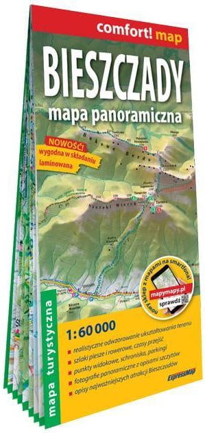 Bieszczady. Mapa panoramiczna Laminowana mapa turystyczna 1:60 000 seria: mapy laminowane data wydania: 2024 data aktualizacji: 2023 format: 11 x 24 cm/100 x 48 cm liczba stron: 2 wersja językowa: polska ISBN: 978-83-8355-230-9 EAN: 9788383552309 Publikacja nagrodzona! Bieszczady. Mapa panoramiczna to wyjątkowa publikacja, w której zastosowano rzut panoramiczny do prezentacji ukształtowania terenu, co w połączeniu z cieniowaniem dało niezwykle realistyczny efekt przestrzenny przypominający widok na góry z lotu ptaka. Jednocześnie mapa prezentuje wszystkie niezbędne dla turysty elementy, m.in.: • szlaki i czasy przejść, • szlaki rowerowe, szlaki kajakowe, ścieżki dydaktyczne i spacerowe, • schroniska turystyczne, wiaty, • obszary „Zanocuj w lesie”, • parkingi, przystanki autobusowe, bankomaty, • punkty i wieże widokowe, • atrakcje przyrodnicze, • muzea, zabytki i inne interesujące turystycznie obiekty. Na odwrocie mapy zamieszczono panoramiczne fotografie najpiękniejszych bieszczadzkich krajobrazów wraz z opisami szczytów. Punkty, z których wykonano zdjęcia, zostały oznaczone na mapie. Fotografiom towarzyszą opisy najatrakcyjniejszych miejsc regionu oraz turystyczno-samochodowa mapa okolic Bieszczadów. Bieszczady. Mapa panoramiczna to unikalna na rynku propozycja zarówno dla turystów zaczynających swoją przygodę z Bieszczadami, jak i wytrawnych wędrowców, którzy dzięki niej spojrzą na góry z nowej perspektywy. Mapa otrzymała wyróżnienie w kategorii mapa i plan turystyczny – Najlepsze publikacje turystyczne 2021 roku, Biblioteka Analiz. W serii map panoramicznych ukazały się także mapy Tatr, Karkonoszy, Gorców i Pienin, Beskidu Śląskiego i Małego, ziemi kłodzkiej.