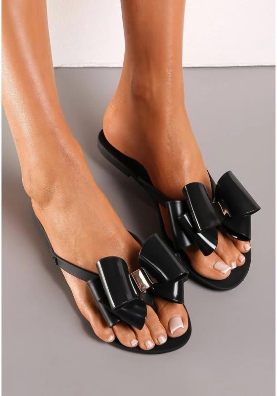 Japonki Nelemene z dużą, ozdobną kokardą na froncie. Osadzone na płaskiej podeszwie, wykonane z gumy. - Kolor: Czarny - Tęgość stopy: Neutralny - Rodzaj obcasa: Płaski - Wkładka/wyściółka: Guma - Materiał: Guma - Nosek buta: Okrągły - Zapięcie: Wsuwany/otwarty - Sezon: Letni