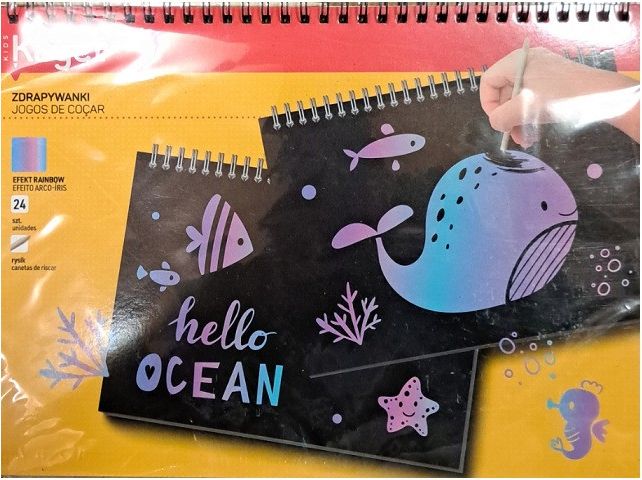 Pamiętacie lekcje plastyki w szkole? Uczyliście się robić wydrapywanki? Malowaliście kredkami świecowymi kartkę papieru a później pokrywaliście ją czarną farbą? Pamiętacie jak długo czekaliście aż wszystko wyschnie i będzie można wydrapywać kolorowe wzorki? Teraz wszystko jest prostsze - bez żmudnego malowania farbą, bez bałaganu i bez czekania. Wspaniały zestaw 24 wydrapywanek w teczce, która ułatwia przechowywanie. Do całości dołączony jest rysik do zdrapywania. Zestaw świetnie nadaje się do zabicia nudy podczas długiej podróży samochodem, albo podczas czekania na posiłek w restauracji. Tematyka wydrapywanek jest bardzo atrakcyjna darówno dla dziewczynek jak i chłopców. Znajdziesz tu obrazki podwodnego świata wraz z jego mieszkańcami - ławice kolorowych rybek na rafie koralowej, groźne rekiny i wesołe foki. Obrazki są eleganckie i pełne swoistego uroku. Dziecko samo wybiera w jaki sposób chce ozdabiać swoją planszę - może wydrapać kilka elementów, może zdrapać całość, lub może wydrapywać wzorki w kilku miejscach.