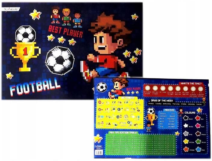 Podkład chroniący biurko przed nadmierną eksploatacją. Wykonany jest ze sztywnej tektury oklejonej z dwóch stron elegancką okleiną. Z jednej strony motywy graficzne Robert Lewandowski, z drugiej walory edukacyjne (w zależności od licencji: tabliczka mnożenia, mapa, podstawy języka angielskiego). …