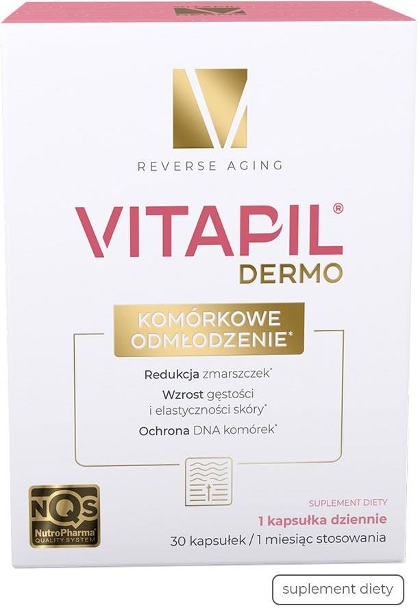 VITAPIL ® DERMO Komórkowe odmłodzenie VITAPIL ® DERMO Komórkowe odmłodzenie to suplement diety zawierający koenzym Q10, witaminę C, resweratrol i astaksantynę. Składniki preparatu wspomagają wzrost gęstości i elastyczności skóry, redukcję zmarszczek i ochronę DNA komórek skóry.* Dane naukowe: Suplementacja astaksantyny (4 mg dziennie) wpływa na kondycję skóry (elastyczność, nawilżenie i redukcję głębokości zmarszczek), a także obniżenie poziomu złuszczania warstwy rogowej naskórka, które nasila się z wiekiem.* Wyniki badań wykazują też, że koenzym Q10 może działać na gęstość i nawilżenie skóry, a także redukcję zmarszczek.* Badania in vivo wskazują na rolę resweratrolu w aktywacji czynnika przeciwstarzeniowego – sirtuiny (SIRT1). Mechanizmy jego działania obejmują m.in. ochronę komórek, w tym DNA, przed nadmiarem wolnych rodników czy też wpływ na funkcjonowanie mitochondriów, będących centrum energetycznym każdej komórki.* Oświadczenia zdrowotne: Witamina C pomaga w prawidłowej produkcji kolagenu, co zapewnia właściwe funkcjonowanie skóry, w tym skóry dojrzałej. *Piśmiennictwo, na podstawie którego powstał tekst etykiety dostępne na www.vitapil.pl lub po zeskanowaniu kodu QR. Dane naukowe nie stanowią oświadczeń zdrowotnych. Prawo UE zakazuje podawania oświadczeń dotyczących wpływu niektórych substancji na zdrowie człowieka. Z tego względu nie podajemy takich oświadczeń zdrowotnych. Udostępniamy natomiast rzetelne badania przeprowadzone nad tymi surowcami być mógł / mogła skorzystać z praw gwarantowanych w art. 54 i 73 Konstytucji RP: swobody otrzymywania informacji i swobody korzystania z wyników badań naukowych. table.vitapiltable { border: 3px solid #000000; width: 81%; text-align: left; border-collapse: collapse; margin: 0 auto; } table.vitapiltable td, table.vitapiltable th { border: 1px solid #000000; padding: 10px 14px; } table.vitapiltable tbody td { font-size: 18px; } table.vitapiltable tfoot td { font-size: 14px; } Składniki aktywne w porcji dziennej (1 kapsułka): witamina C z ekstraktu z dzikiej róży 80 mg (100%**) koenzym Q10 50 mg resweratrol z Polygonum cuspidatum 40 mg astaksantyna AstaZine ® z mikroalg (Haematococcus pluvialis) 4 mg  **Referencyjna Wartość Spożycia Składniki: AstaZine ® ekstrakt z Haematococcus pluvialis standaryzowany na astaksantynę, zatężony ekstrakt z dzikiej róży (owoce) (Rosa canina), substancja glazurująca: hydroksypropylometyloceluloza; koenzym Q10, resweratrol z rdestu japońskiego (korzeń) (Polygonum cuspidatum). Sposób użycia: Osoba dorosła 1 kapsułka dziennie w trakcie posiłku.  Nie należy przekraczać porcji zalecanej do spożycia w ciągu dnia.  Suplement diety nie może być stosowany jako substytut zróżnicowanej diety. Zrównoważony sposób żywienia i prawidłowy tryb życia jest ważny dla funkcjonowania organizmu człowieka. Przeciwwskazania: Nadwrażliwość na którykolwiek ze składników preparatu. Przechowywanie: Przechowywać w temperaturze pokojowej, w suchym miejscu, w sposób niedostępny dla małych dzieci.  Producent NutroPharma Sp. z o.o. ul. Jedności 10 A 05-506 Lesznowola Suplement diety nie może być stosowany jako substytut zróżnicowanej diety. Zrównoważony sposób odżywiania i zdrowy tryb życia są istotne dla prawidłowego funkcjonowania organizmu. Przechowywać w temperaturze pokojowej, w sposób niedostępny dla małych dzieci.