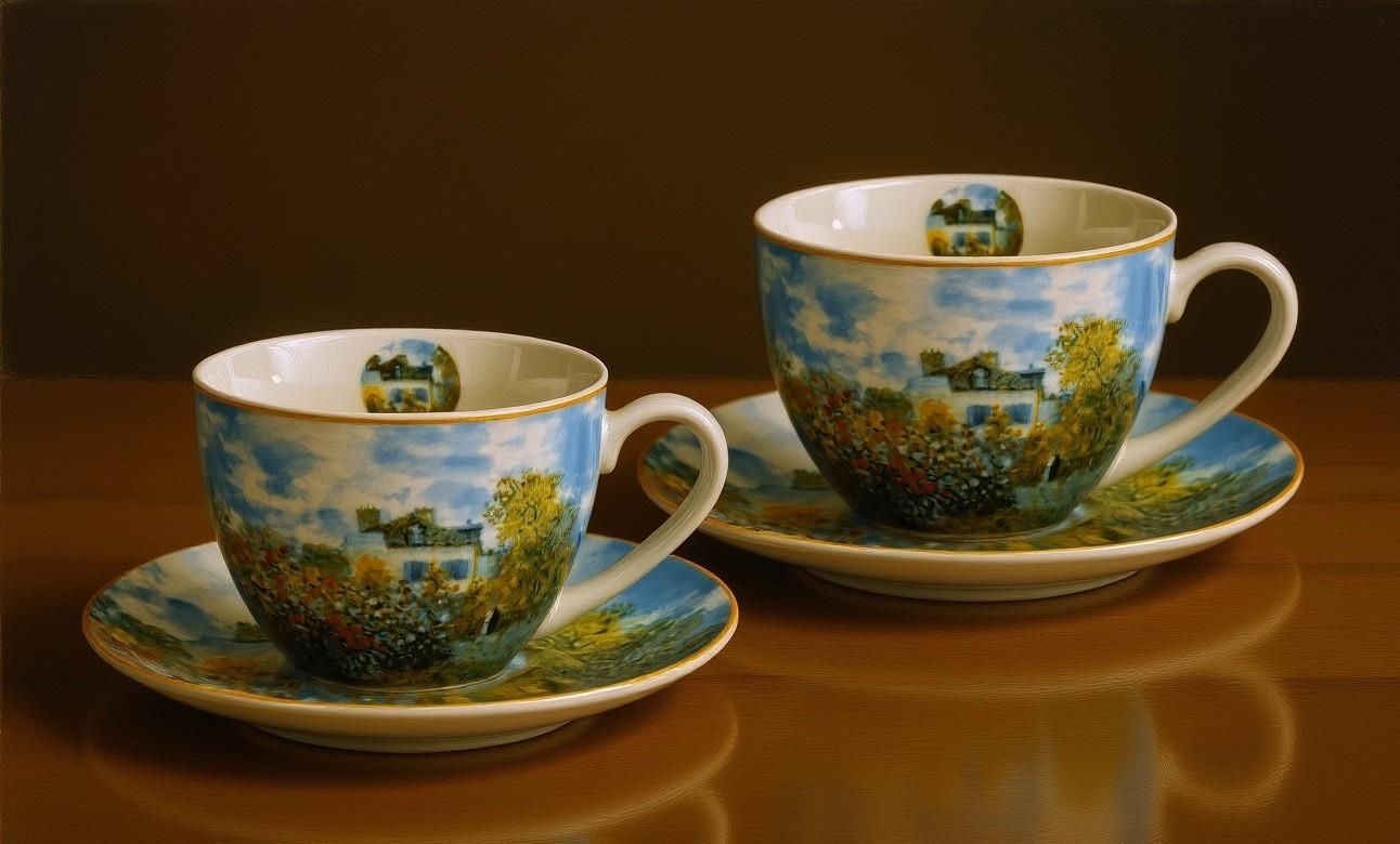 Filiżanki espresso ze spodkami „The Garden at Argenteuil” – inspirowane C. Monet Zestaw dwóch filiżanek espresso ze spodkami to idealna propozycja dla miłośników sztuki i aromatycznej kawy. Wnętrza filiżanek zdobi fragment obrazu Claude’a Moneta „Ogród w Argenteuil” – dzieła pełnego kolorów, …