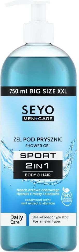SEYO żel pod prysznic, zapach drzewa cedrowego, ekstrakt z mięty i alantoina – dla każdego typu skórySeyo MEN+CARE 2w1 Sport - wielozadaniowy żel do mycia ciała i włosów o unikatowym zapachu drzewa cedrowego. Ekstrakt z mięty, gliceryna i alantoina dają odczucie odświeżenia i pielęgnują. Składnik kondycjonujący włosy zapewnia, że produkt może być stosowany codziennie. Przeznaczony dla każdego typu skóry.Sposób użyciaNanieść niewielką ilość produktu na wilgotne włosy i ciało. Wmasować do powstania piany. Po umyciu spłukać wodą. Chronić przed światłem.