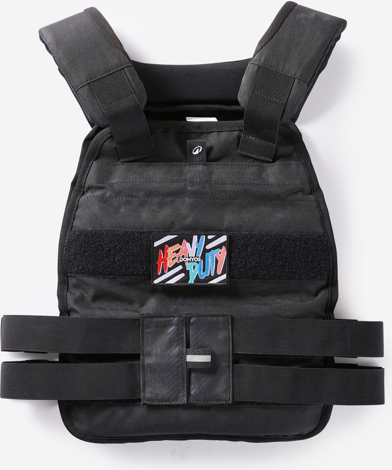 Kamizelka z obciążeniem Corength 6 - 10 kg Poprawiaj cardio i wzmacniaj mięśnie, ćwicząc w kamizelce z obciążeniem regulowanym w zakresie 6 - 10 kg, pozwalającym stopniowo zwiększać intensywność. Zostawia dłoniom pełną swobodę, umożliwiając wykonywanie różnorodnych ćwiczeń. Regulowana na barkach i w zakresie szerokości tułowia. Dopasowuje się do budowy ciała i wytrzymuje obciążenie do 14 kg. Wymiary kamizelki leżącej na płasko: - Długość: 47 cm - Szerokość: 32 cm - Grubość: 9 cm Sama kamizelka z obciążeniem waży 6 kg. W zestawie znajdują się 4 płytki o wadze 1 kg, pozwalające zwiększyć obciążenie do 10 kg. Możesz również użyć dodatkowych ciężarków (np. żeliwnych), wkładając je do kieszeni. Całkowite dopuszczalne obciążenie kamizelki wynosi 14 kg. Używając dodatkowych obciążników do ćwiczeń z masą własnego ciała, które stały się zbyt łatwe, podnosisz stopień trudności i stymulujesz rozwój mięśni. Kamizelka z obciążeniem pozwala zwiększać siłę, eksplozywność i wytrzymałość mięśni. Stanowi ważne akcesorium treningowe. Ta nowa kamizelka pozwala zwiększyć obciążenie do 14 kg (np. poprzez dodanie żeliwnych talerzy), w przeciwieństwie do poprzedniej wersji, która była ograniczona do 10 kg. Nasz zespół przeprojektował szelki, aby zwiększyć komfort wykonywania ćwiczeń. System został ponadto zmodyfikowany z myślą o dopasowaniu do każdej sylwetki. Dodano także rzep pozwalający spersonalizować kamizelkę poprzez umieszczenie na niej logo boxu. Kamizelka z obciążeniem to praktyczne akcesorium pozwalające wykonywać kompletne ćwiczenia, takie jak: - dipsy: wzmacnianie tricepsów, barków i mięśni klatki piersiowej, - podciąganie: wzmacnianie bicepsów i mięśni grzbietu, - muscle-up, - przysiady na jednej lub na dwóch nogach, - burpees: aby pooprawiać cardio.