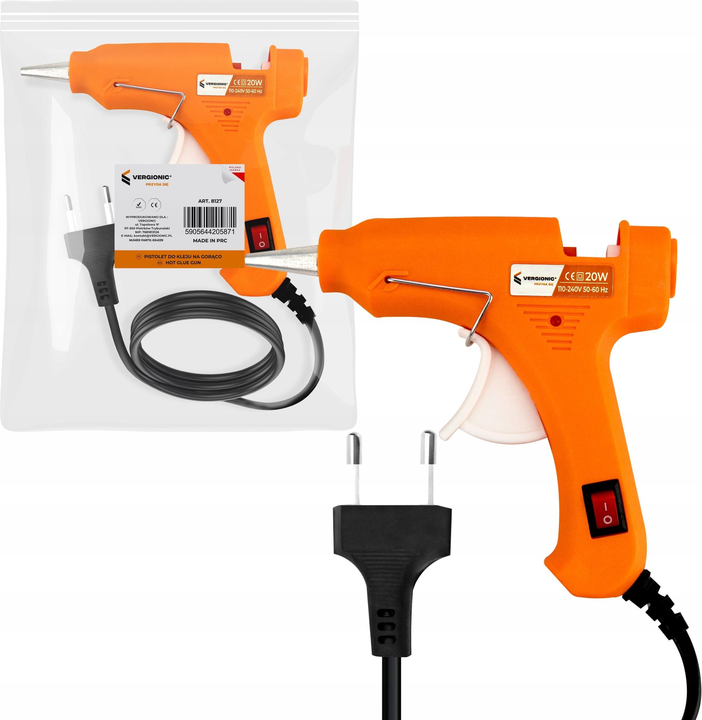 Pistolet do kleju na gorąco do klejenia, na klej, wyciskacz, klejarka 20W Towar zapakowane fabrycznie przez producenta. W skład zestawu wchodzi Pistolet do kleju na gorąco do klejenia, na klej, wyciskacz, klejarka 20W Specyfikacja Zasilanie: 110-240V Moc: 20W Średnica otworu dyszy: 1,5 mm Średnica kleju: 7 mm Długość kabla: 1,12 m Kolor: pomarańczowy Wymiary: 12,8 x 11 x 2,3 cm Waga: 90 g Waga z opakowaniem: 95 g Pistolet do kleju na gorąco to niezwykle praktyczne urządzenie. Jego działanie polega na podgrzewaniu wysoką temperaturą sztyftu kleju i dawkowanie go w małych ilościach. Dzięki szpiczastej, funkcjonalnej dyszy o grubości 1,5 mm, klej można zaaplikować bardzo precyzyjnie i dotrzeć do ciężko dostępnych miejsc. Pistolet jest lekki a do jego użycia wystarczy jedna ręka. Aby zadziałał, musi być podłączany do zasilania sieciowego. Wyposażony został w kabel sieciowy o długości 1,16 m. Szybko się nagrzewa więc nie trzeba tracić czasu na czekanie. Dodatkowo, posiada podpórkę, która pomaga w precyzyjnej pracy i umożliwia odstawienie nagrzanego pistoletu. Dzięki pistoletowi z łatwością można połączyć ze sobą różne materiały, jak np. papier, karton, plastik, drewno lub metal (po wcześniejszym nagrzaniu metalu). Po wyschnięciu kleju materiały będą trwale ze sobą połączone i zabezpieczone przed kolejnym uszkodzeniem. Pistolet jest wykorzystywany nie tylko do drobnych napraw ale również w przypadku różnego rodzaju hobby, np. modelarstwo, decoupage, florystyka czy dekoracja wnętrz.
