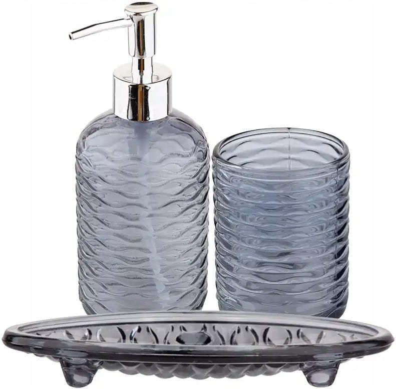 Komplet łazienkowy szklany zestaw mydelniczka kubek pojemnik na mydło Elegancki Zestaw Łazienkowy ze Szkła - Połączenie Estetyki i Funkcjonalności Odkryj wyjątkowy zestaw łazienkowy, który łączy w sobie nowoczesny design z praktycznością. Nasze akcesoria wykonane są z wysokiej jakości szkła, co nadaje każdej łazience elegancki i nowoczesny wygląd. Dzięki odporności na wilgoć i działanie chemikaliów, zestaw ten posłuży Ci przez długi czas, nie tracąc przy tym swojego atrakcyjnego wyglądu. CECHY CHARAKTERYSTYCZNE - Trwałość i Odpowiedniość: Szkło to materiał nie tylko estetyczny, ale także niezwykle trwały, co czyni go idealnym wyborem do pomieszczeń narażonych na wilgoć. - Łatwe czyszczenie: Jednolita, gładka powierzchnia szkła sprawia, że zestaw jest łatwy do czyszczenia i dezynfekcji, co znacząco ułatwia utrzymanie higieny w łazience. - Uniwersalne akcesoria: Zestaw składający się z mydelniczki, kubka na szczoteczki oraz dozownika do mydła doskonale wpasuje się w różnorodne aranżacje łazienkowe, spełniając różne potrzeby użytkowników. - Duża głowica pompki: Dzięki innowacyjnemu systemowi, dozownik zawsze zapewnia odpowiednią ilość mydła, co eliminuje marnowanie produktu. - Praktyczne detale: Mydelniczka z rantem skutecznie zapobiega wypadaniu mydła, a kubek z łatwością pomieści szczoteczki oraz pastę do zębów, co czyni ten zestaw idealnym rozwiązaniem dla każdej rodziny. Skład kompletu Dozownik z pompką Wysokość: 19 cm Szerokość: 7,2 cm Pojemność: 410 ml Kubek Średnica: 8 cm Wysokość: 10 cm Mydelniczka Długość: 15,5 cm Szerokość: 10 cm Wysokość: 2 cm