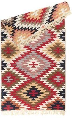 Dywan ETNO aztecki 80 cm x 150 cmDywan Etno w kolorowy aztecki wzór będzie oryginalną ozdobą Twojego salonu, sypialni czy biblioteki. Jest łatwy do czyszczenia i odporny na odkształcenia.Przyciągający wzrok wzórDywan zdobi oryginalny geometryczny wzór w wyrazistych kolorach. Dwie krawędzie zdobią białe frędzle. Połączenie tych elementów sprawia, że dywan wpisuje się w styl boho. Jednocześnie zastosowana kolorystyka jest na tyle uniwersalna, że chodnik ładnie połączy się w większością wnętrz. Stworzy piękne, spójne połączenie z drewnianymi, naturalnymi dodatkami ale również z surowymi o błyszczącej powierzchni, tworząc efektowny kontrast. Wyraźny wzór ożywi aranżację wnętrza i doda jej niebanalnego uroku.Dywan znakomicie przewodzi ciepło, sprawdzi się więc w pomieszczeniach z ogrzewaniem podłogowym.Dywan tkany na płaskoDywan został utkany na płasko, ten typ chodników jest nazywany także sznurkowym. Są one bardzo wygodne w codziennym użytkowaniu i łatwe do czyszczenia. Dzięki gęstemu splotowi zabrudzeniom ciężko jest przeniknąć w głąb włókien, pozostają one na powierzchni i dzięki temu łatwo je usunąć. Tak tkany dywan jest też idealnym rozwiązaniem jeśli posiadasz zwierzęta, ponieważ usunięcie z niego sierści nie stanowi żadnego problemu. Dodatkowo chodnik tkany płasko jest odporny na odkształcenia, więc nawet ciężki mebel nie powinien zostawić na nim trwałych śladów. Zobacz wszystkie dywany tkane na płasko
