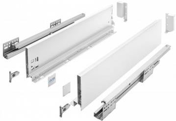 Szuflada AXIS PRO GTV średnia H-116 L=550 Biała Cechy produktu Producent: GTV Materiał: stal Pokrycie: lakierowana proszkowo Kolor: biały Obciążenie: 40 kg Wysokość boku : 116 mm Wysokość przestrzeni montażowej: 147 mm Długość szuflady: 550 mm Funkcja spowolnienia przy zamknięciu Regulacja (pion i poziom) Grubość boków szuflady 14 mm AXIS PRO dedykowany jest do płyty #16 mm Zestaw nie zawiera płyty meblowej. Instrukcje montażu w formie PDF znajdziemy poniżej w informacjach dodatkowych. Zawartość zestawu boki szuflad ( lewy oraz prawy) komplet prowadnic mocowanie ścianki tylnej mocowanie frontu wraz z wkrętami zaślepki otworów regulacyjnych Szuflada Axis Pro charakteryzuje się wysoką trwałością certyfikowaną na 60 000 cykli. Sercem systemu jest niezawodna prowadnica która jest pełnego wysuwu z funkcją cichego domykania gwarantując cichą pracę i delikatne zamykanie szuflady. Wysokość szuflady sprawi, że idealnie dopasujesz ją do swojej kuchni, garderoby, łazienki, a bok szuflady o szerokości tylko 14 mm umożliwia maksymalne wykorzystanie wewnętrznej przestrzeni mebla. Obciążenie szuflady pozwala na umieszczenie w niej aż 40 kg różnych produktów. Uniwersalne zastosowanie System szuflad AXIS PRO to rozwiązanie do każdego typu pomieszczeń. Modny design Cienki płaszcz boczny o szerokości zaledwie 14 mm nadaje szufladzie prosty i nowoczesny wygląd umożliwia stworzenie wielu niecodziennych aranżacji. Komfort pracy i użytkowania Zastosowanie nowego mechanizmu zwiększa kulturę pracy szuflady oraz gwarantuje najwyższą jakość ruchu. AXIS PRO to również prosta regulacja frontu w płaszczyźnie pionowej i poziomej.