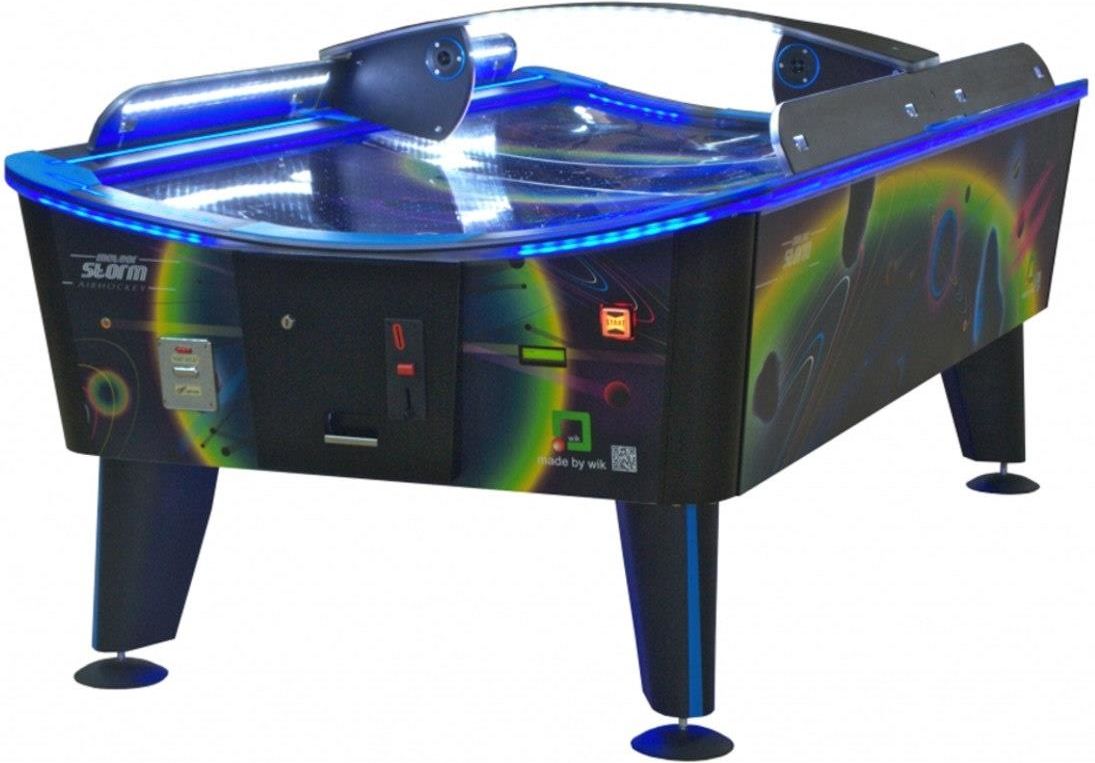 Słynny na całym świecie air hockey Skate ma teraz brata! Storm to bardziej stonowana wersja przebojowego air hockey'a o nietypowym kształcie pola gry. Produkt jest całkowicie wodoodporny - dzięki innowacyjnym technologiom zastosowanym przy jego produkcji, urządzenie może być użytkowane na zewnątrz praktycznie przez cały rok. Nawet, jeżeli użytkowanie automatu na zewnątrz nie jest planowane, jego wodoodporność może przydać się również pod zadaszeniem, ponieważ chroni urządzenie przed awarią spowodowaną zalaniem napojem. Unikalny kształt blatu wpływa na szybkość gry i gwarantuje świetną zabawę. Niecodzienny wygląd i zaawansowane technologie sprawiają, że Storm zarabia dla swoich właścicieli nawet do 40% więcej, niż tradycyjny cymbergaj, a co za tym idzie, szybciej zwracają się zainwestowane w niego pieniądze. Rozbudowany software pozwala na wgrywanie własnych melodii, zapowiedzi i sygnałów, a zintegrowany system suszenia w łatwy i szybki sposób umożliwia odprowadzenie wilgoci z urządzenia. Dodatkowym atutem jest szybki montaż i demontaż stołu. Charakterystyka: perforowane pole gry wykonane z poliwęglanu podświetlenie LED korony stołu osłony boczne i środkowa zapobiegające wypadaniu krążka z pola gry efektowne podświetlenie LED pola gry i nóg wrzutnik elektroniczny RM5 lub NRI elektroniczny wyświetlacz wyników dla obu graczy nadmuch powietrza za pomocą wentylatora o mocy 260 W umieszczonego wewnątrz stołu zasilanie 230V/50Hz; pobór mocy 60 W w trybie demo i 390 W w trybie gry akcesoria: 4 odbijaki, 6 krążków