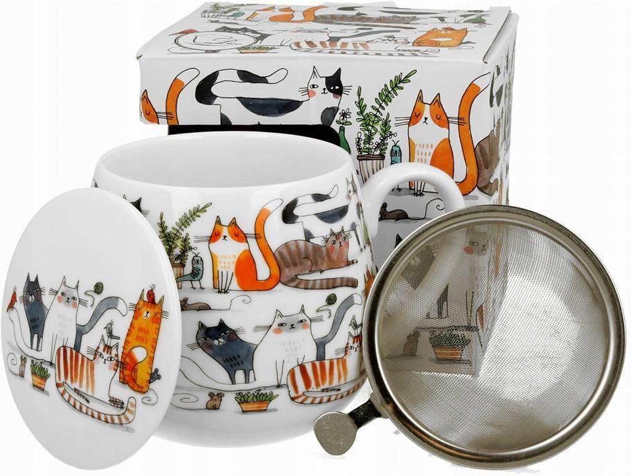 Duży kubek baryłka z zaparzaczem i pokrywą z kolekcji Koci Świat Leniwe Koty wchodzący w skład serii Animals to niezwykle piękna porcelana. Całościowo wykonany w naturalnym kolorze z delikatnym połyskiem, który nada charakteru i funkcjonalności w codziennym użytkowaniu. Produkt zawiera zaparzacz do parzenia herbaty, ziół oraz pokrywkę, która w trakcie parzenia pozwala zaparzyć gorący napój z liści, a po wyjęciu sita posłuży jako podstawka pod zaparzacz. Charakteryzuje się ciekawym zdobieniem przedstawiający motyw domowych kotów w trakcie typowych codziennych zajęć. Utrzymany w filuternym klimacie oraz klasycznej kolorystyce, która zdecydowanie wyróżnia kolekcję Koci Świat Leniwe Koty. Wykonany z wysokiej jakości porcelany New Bone China z idealnie dopracowanym wykończeniem, natomiast sito ze stali nierdzewnej. Łatwy w utrzymaniu czystości, odporny na zarysowania. Produkt zapakowany w ozdobne pudełko dekorowane tym samym motywem. Jest to doskonały pomysł na niebanalny prezent dla każdego. Można używać w kuchence mikrofalowej oraz myć w zmywarce. Specyfikacja: Średnica kubka: 8 cm Szerokość z uchem: 12,5 cm Wysokość kubka: 9,8 cm Pojemność filiżanki: 430 ml Materiał wykonania: Porcelana Kolor: Wielokolorowy Producent: Duo