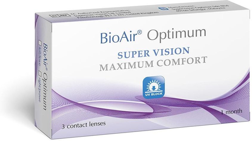 Miesiesięczne Soczewki Kontaktowe BioAir Optimum Parametry soczewek Krzywizna: 8.60 Średnica: 14.20 Ilość szt. : 3 o tej samej mocy Opis produktu Soczewki miesięczne BioAir OPTIMUM opak. 3 szt. o tej samej mocy Soczewki miesięczne BioAir Optimum to wysokiej jakości soczewki kontaktowe zapewniające doskonały komfort widzenia przez cały dzień. BioAir Optimum zostały zaprojektowane korzystając z technologii hydrożelowej, która utrzymuje wilgoć i zwiększa przepuszczalność tlenu. Wysoka zawartość wody, bo aż 50%, zapewnia wysoką jakość nawilżenia oka przez cały dzień. Dzięki swoim cechom soczewki BioAir Optimum gwarantują: -lepszą ostrość widzenia z każdej odległości -wyraźniejszy i o wiele bardziej przejrzysty obraz widzenia -znakomity komfort -wysoka zawartość wody