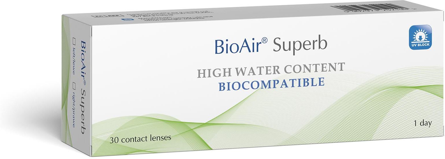BioAir Superb 30 szt. BioAir Superb to jednodniowe soczewki kontaktowe wykonane z wysoko nawodnionego materiału Omafilcon A o 58% zawartości wody. Soczewki zostały zaprojektowane w taki sposób, by przez cały dzień utrzymywać poziom nawilżenia i najwyższy komfort noszenia. Soczewki zawierają filtr UV. Soczewki jednodniowe to najbezpieczniejsza forma korekcji swojego wzroku, ponieważ żadne drobnoustroje nie są w stanie osiedlić się na powierzchni soczewki, którą każdego dnia wymieniamy na nową. Bez potrzeby noszenia płynów do pielęgnacji, bez ryzyka alergii. Parametry soczewek: Moc : -0.50D do -8.00D (-0.50 do -6.00 co 0.25D, -6.00 do -8.00 co 0.50D) Krzywizna: 8.60 Średnica: 14.20 Ilość szt. w pudełku: 30 Data ważności: min 12 miesięcy