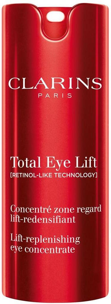 Kompleksowy krem pod oczy z technologią Clarins „LIFT”, opracowany specjalnie z myślą o rewitalizacji okolic oczu. Uzupełnienie. A gdyby tak zyskać moc odmłodzenia okolic oczu w zaledwie kilka sekund? To właśnie obiecuje Total Eye Lift i jego 30-sekundowy efekt liftingu*. Technologiczny przełom z podwójną innowacją w nauce i formule. [RETINOL-LIKE TECHNOLOGY] - Silny organiczny ekstrakt z harongi, o skuteczności zbliżonej do retinolu**, łagodny dla skóry wokół oczu. Opatentowany***, stworzony przez Laboratoria Clarins składnik aktywny zwiększa produkcję kolagenu 12-krotnie.**** W połączeniu z nowym biotechnologicznym ekstraktem z czerwonej janii zapewnia długotrwały efekt liftingu okolic oczu. PRO-TIGHTENING MATRIX - Ten komfortowy, otulający balsam tworzy na skórze warstwę ujędrniającą, zapewniając natychmiastowy efekt liftingu. Skuteczność tekstury została potwierdzona naukowo dzięki nowemu testowi instrumentalnemu Clarins. Dostępne w wersji do ponownego uzupełniania.***** Zachowaj buteleczkę od Total Eye Lift, aby móc ją później ponownie napełnić. *Samoocena 111 kobiet. **Porównawcze badanie kliniczne skuteczności przeciwzmarszczkowej i wygładzającej przeprowadzone na 46 kobietach stosujących przez 56 dni formułę zawierającą organiczny ekstrakt z harongi lub retinol z takim samym % składnikiem jak gotowy produkt. ***Dwa patenty Clarins zarejestrowane we Francji dotyczące skuteczności wyciągu z harongi. **** Badanie in vitro na ekstrakcie z harongi. ***** Refill nie może być stosowany samodzielnie.