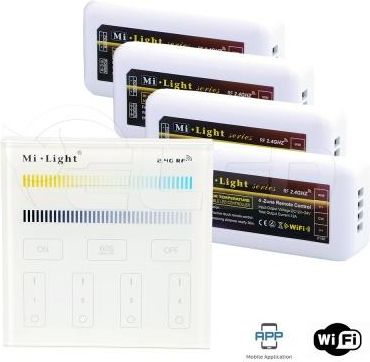 Prezentowany ściemniacz LED radiowy CCT, to gotowy zestaw, pozwalający na sterowanie oświetleniem LED ze zmienną temperaturą barwową (taśma CCT). W skład takiego zestawu wchodzi panel naścienny wraz z odbiornikami LED (dostępnych w wariantach) które zapewniają indywidualny dostęp do czterech stref sterowanych poprzez dotykowy panel naścienny. Łączność odbiorników oparta jest na bezprzewodowym sygnale radiowym na poziomie 2,4GHz. Oznacza to w pełni bezprzewodowe sterowanie w zasięgu 30 metrów. Panel naścienny przeznaczony jest do montażu natynkowego. Oferowany ściemniacz występuje w kilku wariantach: dwoma, trzema oraz czterema odbiornikami do wyboru. Charakterystyczne funkcje dla zestawu Załączanie oraz wyłączenie podłączonego oświetlenia LED (strefa) Załączenie oraz wyłączenie wszystkich stref jednocześnie Ściemnianie oraz rozjaśnianie podłączonego oświetlenia LED (strefa) Ściemnianie oraz rozjaśnianie wszystkich stref jednocześnie Zmiana temperatury barwowej podłączonego oświetlenia LED (strefa) Zmiana temperatury barwowej dla wszystkich stref jednocześnie Natychmiastowe zmniejszenie natężenia jasności (tryb nocny) Wyłączenie oświetlenia z 60 sekundowym opóźnieniem Cechy dla zestawu Obsługa do czterech stref Zasilanie na baterie (2x AAA 1,5V) Zasięg radiowy wynoszący do 30 metrów Maksymalne obciążenie odbiornika 10A Możliwość rozbudowy instalacji (dodatkowy odbiornik) Szklany panel naścienny Sygnalizacja akustyczna Delikatne podświetlenie diody ukazujące prace urządzenia Budowa przystosowana do montażu natynkowego Gwarancja 24 miesiące Podstawowa komunikacja z odbiornikami odbywa się przy pomocy drogi radiowej. Uzyskanie opcjonalnego sterowania poprzez łączność z siecią Wi-Fi, która umożliwia kontrolę oświetlenia przy pomocy urządzeń mobilnych (np. smartfon lub tablet), dostępna jest tylko i wyłącznie po zastosowaniu odpowiedniego modułu Wi-Fi. Możliwość sterowania Wi-Fi Aby uzyskać dostęp do sterowania poprzez sieć Wi-Fi należy zakupić odpowiedni moduł, który znajdą Państwo w zakładce ,,Produkty powiązane" Zasilanie odbiornika – złącza ułatwiające montaż Urządzenia odbiorcze zasilane są napięciem stałym o wartości 12VDC bądź 24VDC, które musi być doprowadzone na wejście urządzenia. W celu ułatwienia montażu, budowa odbiorników składa się z zacisków śrubowych, zarówno na wejściu jak i wyjściu, co znacznie ułatwia doprowadzenie przewodów do urządzenia. Ponadto gdy posiadacie Państwo zasilacz, który na wyjściu posiada wtyk DC, możecie bezpośrednio wpiąć się do gniazda DC, znajdującego się obok zacisków wejściowych odbiornika. Połączenie przewodów jest stabilne i szybkie w montażu. Budowa panelu naściennego - mały dotyk, duże możliwości Panele naścienne serii Mi-Light, różnią się swoją budową w zależności od prezentowanego modelu. Spójnym elementem są dotykowe pola sterownicze, które odpowiadają różnym funkcją. Na środku panelu naściennego znajduję się przycisk odpowiadający za włączenie/wyłączenie podłączonego oświetlenia LED, jasność oraz temperaturę barwową w przypadku sterowników CCT, uzyskujemy przy pomocy dotykowego pola sterowniczego typu slider. Zasada działania zmiany kolorów w przypadku sterownika wielokolorowego RGB, RGB+W lub RGB+CCT jest taka sama, zmianę uzyskujemy poprzez tarcze na której znajdują się ułożone poszczególne kolory lub dotykowych sliderów. Reszta przycisków odnosi się już do charakterystycznych funkcji dostępnych dla danego modelu, które ukazane są na dołączonym obrazku. W zestawie: Panel naścienny Mi-Light CCT - FUTB2 Odbiornik LED CCT - 10A 12-24V (od 2 do 4 szt. w zależności od wyboru) Instrukcje użytkownika