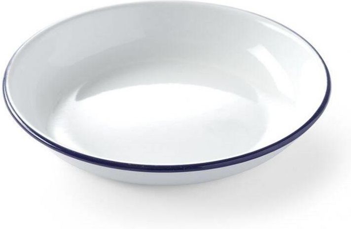 Talerz głęboki o średnicy 20 cm. Wykonany z wysokiej jakości stali pokrytej białą emalią z niebieskim brzegiem. Możliwość piętrowania, Można myć w zmywarkach. Nie należy używać w kuchenkach mikrofalowych.