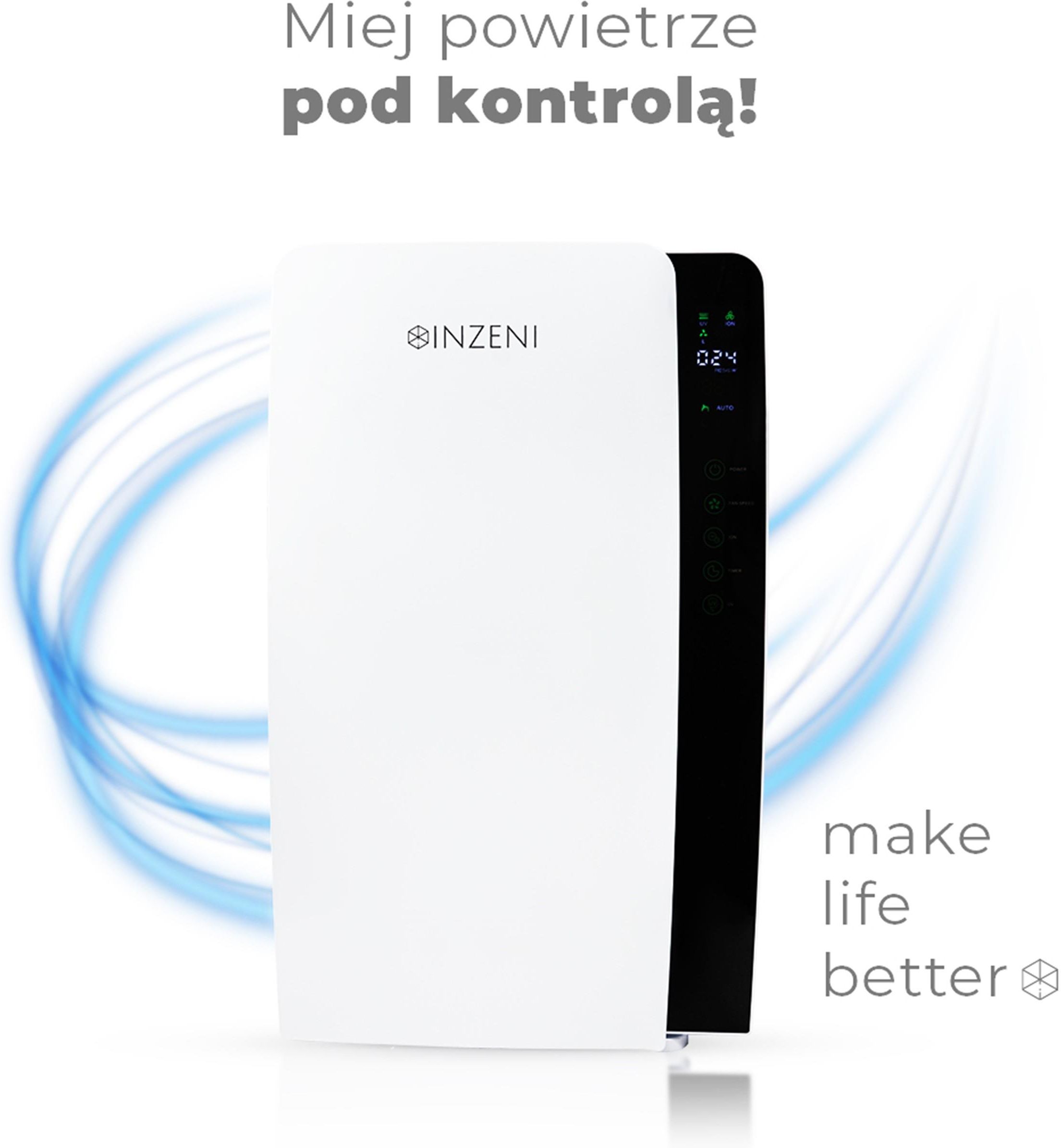 Oczyszczacz powietrza INZENI J001 Model 2025 J001 to nowoczesny markowy oczyszczacz powietrza z funkcjami sterylizacji dla najbardziej wymagających użytkowników zamieszkujących tereny narażone na bardzo duże zapylenia i nie zdrowe powietrze. Oczyszczacz powietrza Inzeni J001 to wielofunkcyjne urządzenie, które ma w sobie wszystko czego potrzebujesz, aby mieć czyste i świeże powietrze w Twoim otoczeniu. Oczyszczacz posiada kilka funkcji: potrójny system filtracji (wstępny, węglowy, HEPA13) wbudowana lampa UV - sterylizacja wirusowa i bakteryjna wbudowany jonizator - dobre samopoczucie i koncentracja dzięki którym powietrze w Twoim otoczeniu będzie czyste, wolne od nieprzyjemnych zapachów, grzybów, pleśni, bakterii i wirusów. Idealnie sprawdzi się zarówno w Twoim domu (salon, sypialnia) jak również w biurach, szkołach, przedszkolach, żłobkach czy instytucjach użytku publicznego. 🔵 System filtracji Oczyszczacz INZENI J001 posiada 3 stopniowy system filtracji zintegrowane w jednym filtrze Filtr wstępny Montowany przy wlocie powietrza. Wykonany z drobnej mikronowej siateczki skutecznie, bo w ponad 99%, blokuje włókniste cząstki stałe o średnicy od 2,5 mm i większe. Jego zadaniem jest blokada większych zanieczyszczeń: włosów, sierści, kurzu czy też okruchów tak by nie dostały się one do kolejnych filtrów i nie spowodowały ich zapchania. Filtr wstępny można wielokrotnie myć pod bieżącą ciepłą wodą bez użycia detergentów. Przed ponownym montażem należy go dobrze osuszyć. Filtr HEPA 13 Wykonany z cienkiego jak papier materiału filtracyjnego wykonanego z włókna szklanego o charakterystycznej wielkości włókien oraz odpowiednim ich rozłożeniu. Skuteczne, bo w 99,9%, usuwa z powietrza zanieczyszczenia o cząsteczkach z zakresu wielkości od 0,003 μm do ponad 10 μm takie jak między innymi: pyły zawieszone m.in. PM2.5, PM10 pyłki roślin, zarodniki pleśni czy alergeny roztoczy unoszący się kurz i sierść niektóre bakterie, wirusy i zarodniki grzybów Filtr z aktywnym węglem + filtr foto-katalityczny Filtry węglowe uzupełniają pracę filtrów HEPA. Usuwają organiczne zanieczyszczenia gazowe takie jak między innymi lotne związki organiczne, dym z papierosów oraz odory. Filtry foto-katalityczne przyspieszają reakcje chemiczne. Rozdrobniony tlenek tytanu pod wpływem światła wzmacnia bakteriobójcze działanie filtra UV. 🔵 Wymiana filtrów Twój oczyszczacz INZENI J001 sam przypomni Ci o konieczności wymiany filtra. Zainstalowany wewnątrz urządzenia chip odpowiadający za pomiar czasu pracy urządzenia umożliwia rozpoznanie czasu w którym należy wymienić filtr. Zalecany czas pracy, po którym powinieneś wymienić filtr to 3000 godzin pracy. Lampa UV Skutecznie usuwa wiele powszechnych bakterii i wirusów hamując zarazem ich powstawanie i rozmnażanie. Lampa nie wydziela ozonu, można jej bezpiecznie używać. Jonizacja Skutecznie neutralizuje i usuwa z powietrza m.in. bakterie, wirusy, alergeny i zarodniki pleśni. Przebywanie w powietrzu naładowanym jonami ujemnymi wpływa korzystnie na nasze samopoczucie, minimalizuje objawy alergii i sprzyja leczeniu chorób układu oddechowego. 🔵 Pyły PM10.5 i PM2.5 PM2.5 – najdrobniejszy i najgroźniejszy PM2,5 jest pyłem zbudowanym z cząsteczek nie większych niż 2,5 mikrometra. To niewielkie, niewidoczne gołym okiem cząstki. Najczęściej pochodzą z pieców centralnego ogrzewania, aut, czy nawet fabryk. Głównym zagrożeniem płynącym z wdychania tego typu substancji jest fakt, że bez problemu wnika ona do układu oddechowego, a następnie osadza się na jego ściankach. W ten sposób właśnie rozpoczyna się znaczna część chorób takich, jak astma, czy alergia. PM10 – większy, ale równie niebezpieczny PM10.5 to pył o bardzo podobnej charakterystyce. Mimo iż jest czterokrotnie większy, równie mocno zagraża naszemu zdrowiu. W jego składzie mogą znajdować się zarówno związki organiczne, nieorganiczne, jak i substancje toksyczne, które dzięki rozmiarowi mają znacznie ułatwioną drogę do naszego układu oddechowego. Zarówno PM10 jak i PM2.5 przyczyniają się do wielu chorób. Niemal natychmiast po wniknięciu do organizmu powodują zadyszkę ustępującą dopiero po całkowitym wydaleniu toksyn. Co ważne, związki te w dużym stężeniu powodują astmę, problemy z sercem, a nawet całym układem krwionośnym, dlatego nie wolno wystawiać się na długie oddziaływanie smogu. Oczyszczacz powietrza INZENI J001mierzy jakość powietrza i automatycznie dostosowuje natężenie jego przepływu, dzięki czemu jest znacznie bardziej efektywny w oczyszczaniu powietrza. Czujnik wykrywa stopień zanieczyszczenia pyłów PM2.5 i mienia kolor podświetlenia na wyświetlaczu 🔵 Funkcje 4 poziomy pracy Możesz sam ustawić żądaną przez siebie prędkość pracy urządzenia lub pozwolić pracować swojemu oczyszczaczowi w trybie automatycznym. Dzięki czujnikowi jakości powietrza urządzenie jest w stanie precyzyjnie określić ilość zanieczyszczeń w pomieszczeniu i dostosować do tego swoją pracę. A w nocy ? Tryb nocny ma wbudowany czujnik światła. Jeśli natężenie światła w Twoim pokoju będzie niskie, urządzenie automatycznie przejdzie w cichy tryb pracy (silent) tak, by nie zakłócać Twojego wypoczynku podczas snu. Głośność urządzenia wynosi wtedy tylko około 20dB. Ustawienie czasu pracy Jeśli chcesz, żeby Twój oczyszczacz pracował cały czas możesz pozostawić go w trybie auto. Jednak masz możliwość zaprogramowania automatycznego wyłączenia. Timer działa od 1 do 24 godzin z odstępami jednogodzinnymi. Nie musisz pamiętać, żeby go wyłączać przed wyjściem z domu. 🔵 Oczyszczaczem można sterować na 2 sposoby: manualnie - bezpośrednio na panelu dotykowym urządzenia pilotem - jest w zestawie Oczyszczacz powietrza INZENI J001 wyłapuje nie tylko kurz i zanieczyszczenia, ale też cząsteczki p